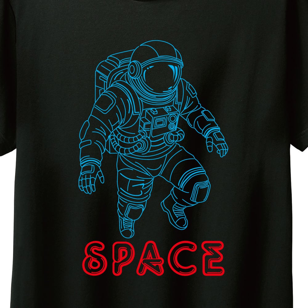 鮮やかなブルーのラインで描かれた宇宙飛行士のイラストと、レトロな雰囲気のレッドネオン風SPACEロゴが、シンプルながらも目を引くデザイン。