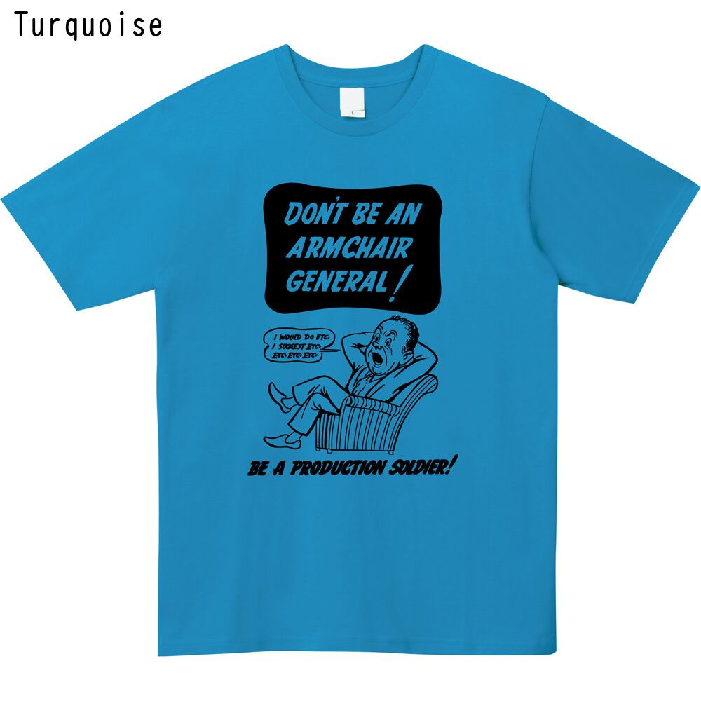 デザイン:「DON'T BE AN ARMCHAIR GENERAL! BE A PRODUCTION SOLDIER!」という力強いメッセージと、それに反してリラックスした”将軍”のイラストがユニークなプリントTシャツです。