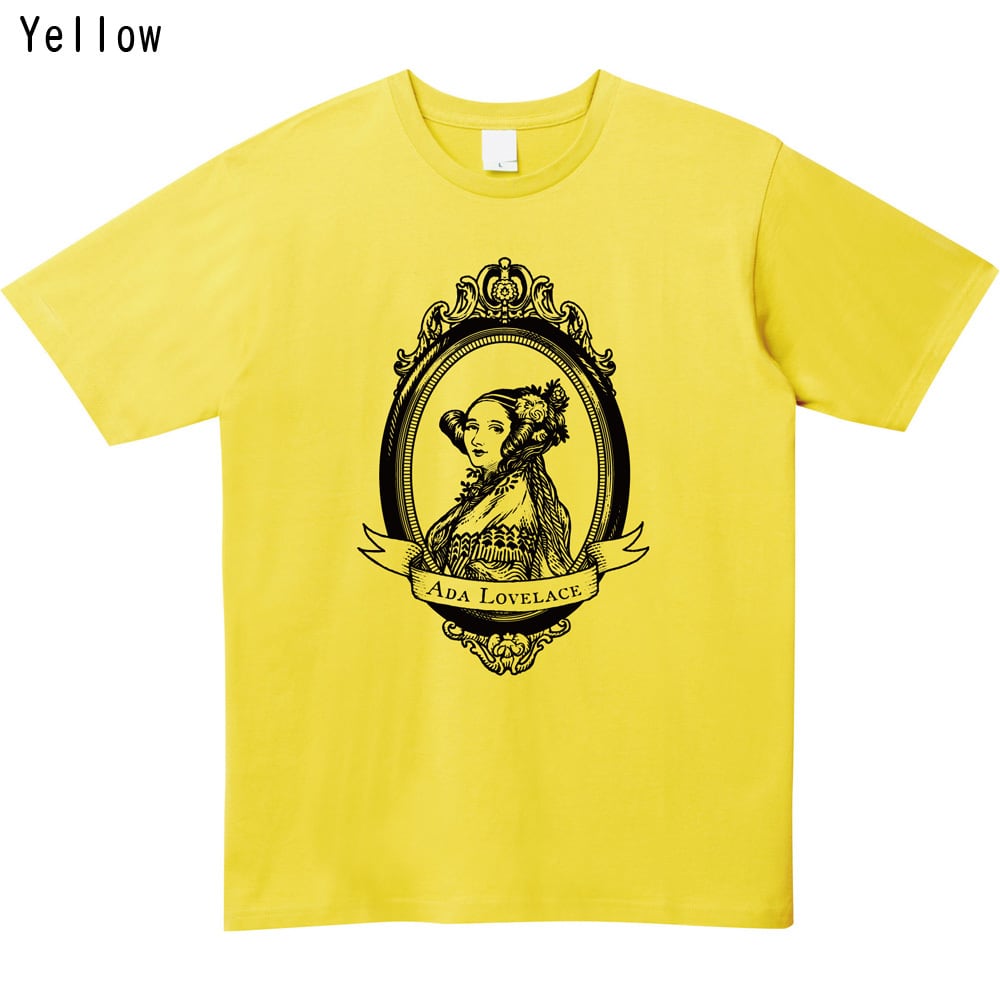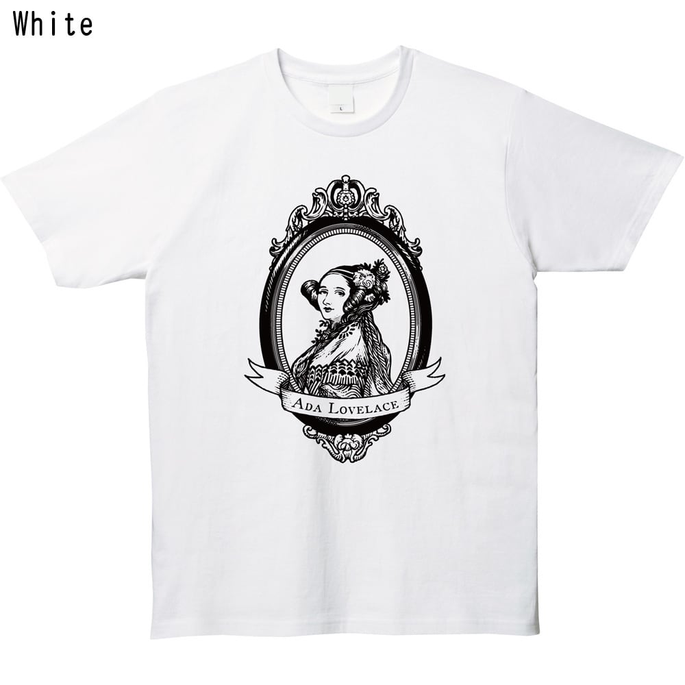 コンピュータサイエンスの母、エイダ・ラブレスの肖像をあしらった、知的でクラシカルなプリントTシャツです。