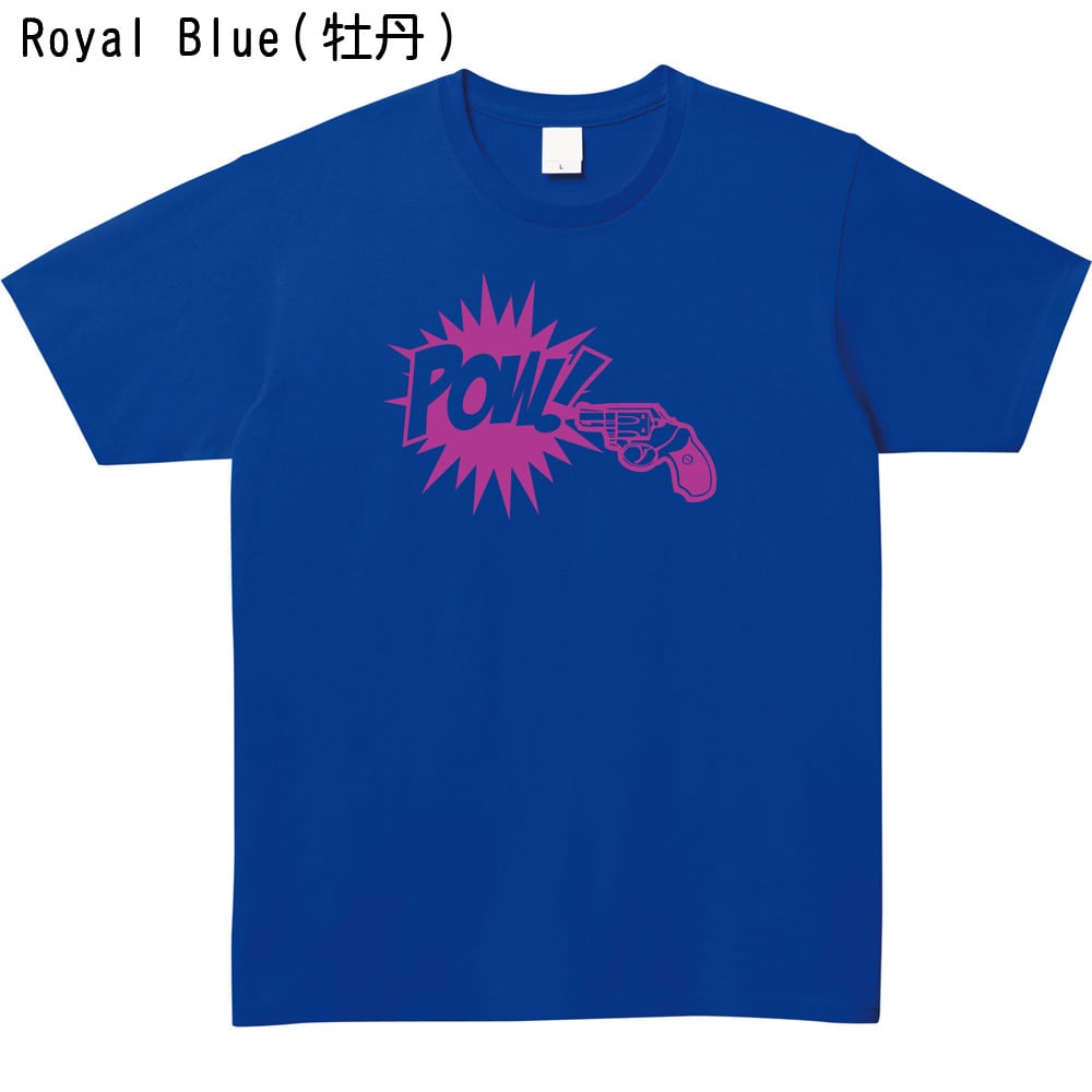 銃と爆発音の「POW!」の文字が大胆にプリントされており、着るだけでユニークな個性を演出できます。