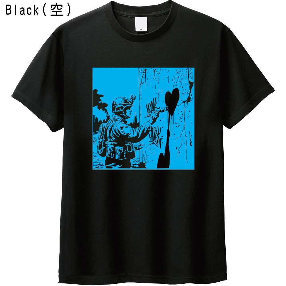 このTシャツは、紛争や破壊の象徴である兵士が、銃ではなく筆を手に取り、壁にハートを描くという、強烈なコントラストで平和への願いを表現しています。