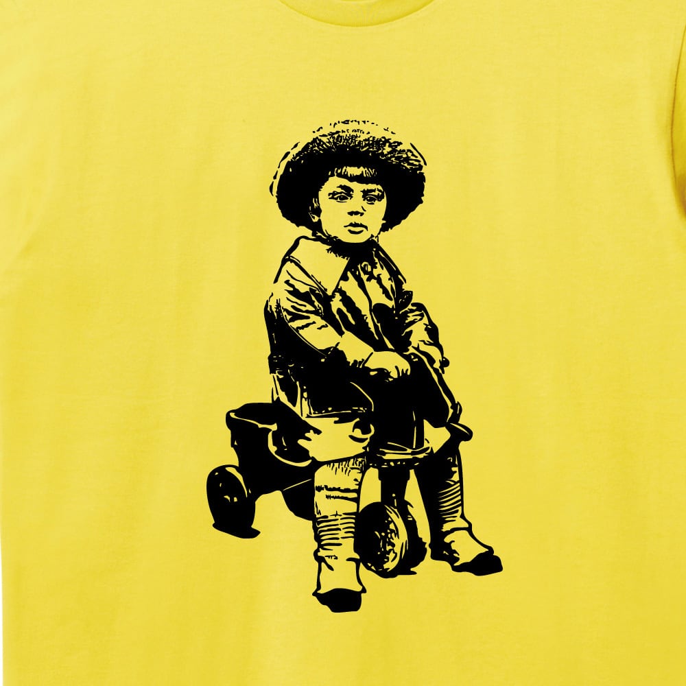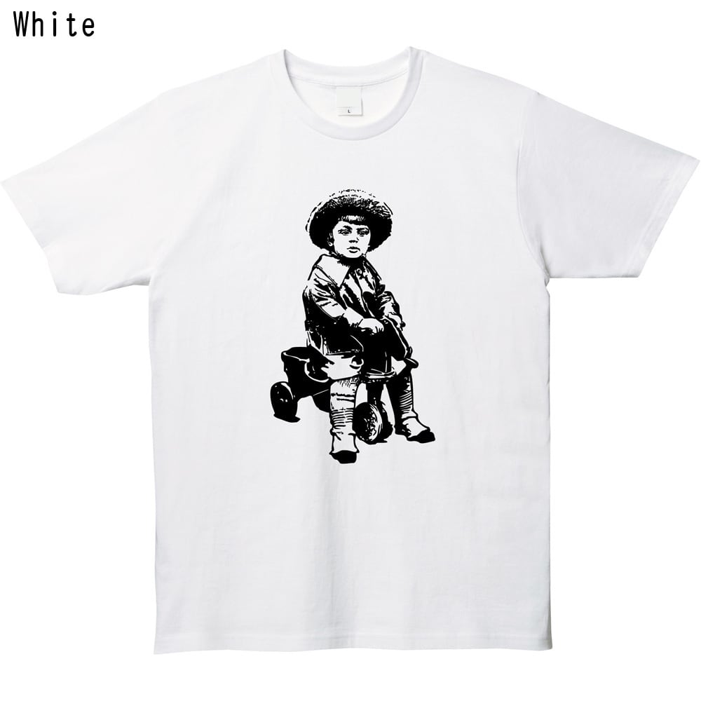 このTシャツは、レトロな雰囲気の少年と三輪車のプリントが特徴です。