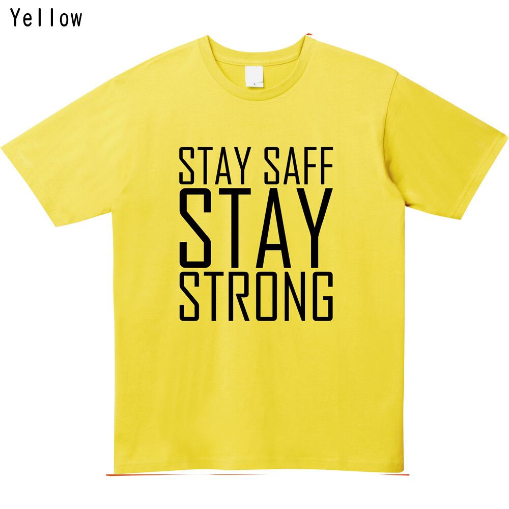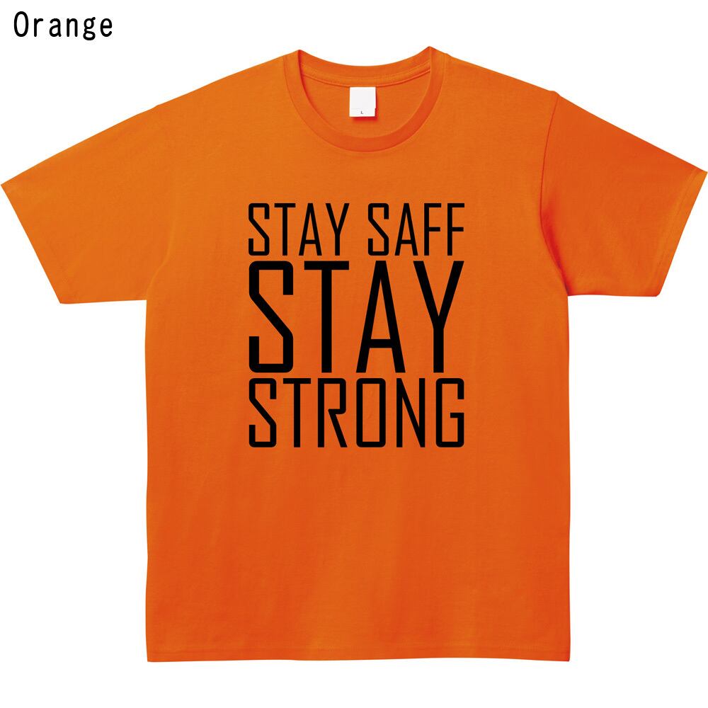 「STAY SAFE (安全に)」「STAY STRONG (強く)」というポジティブな合言葉を、視認性の高いフォントで大胆にプリントしました。
