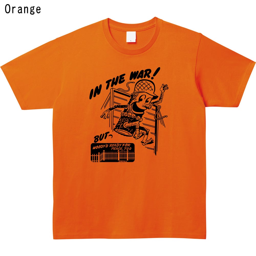 兵士の格好をした擬人化された木のキャラクター「Woody」が、「IN THE WAR! BUT- WOODY'S READY FOR PEACE, TOO」(戦争に参加している!しかし、ウッディは平和への準備もできている)という反戦と平和のメッセージをユーモラスに伝えます。