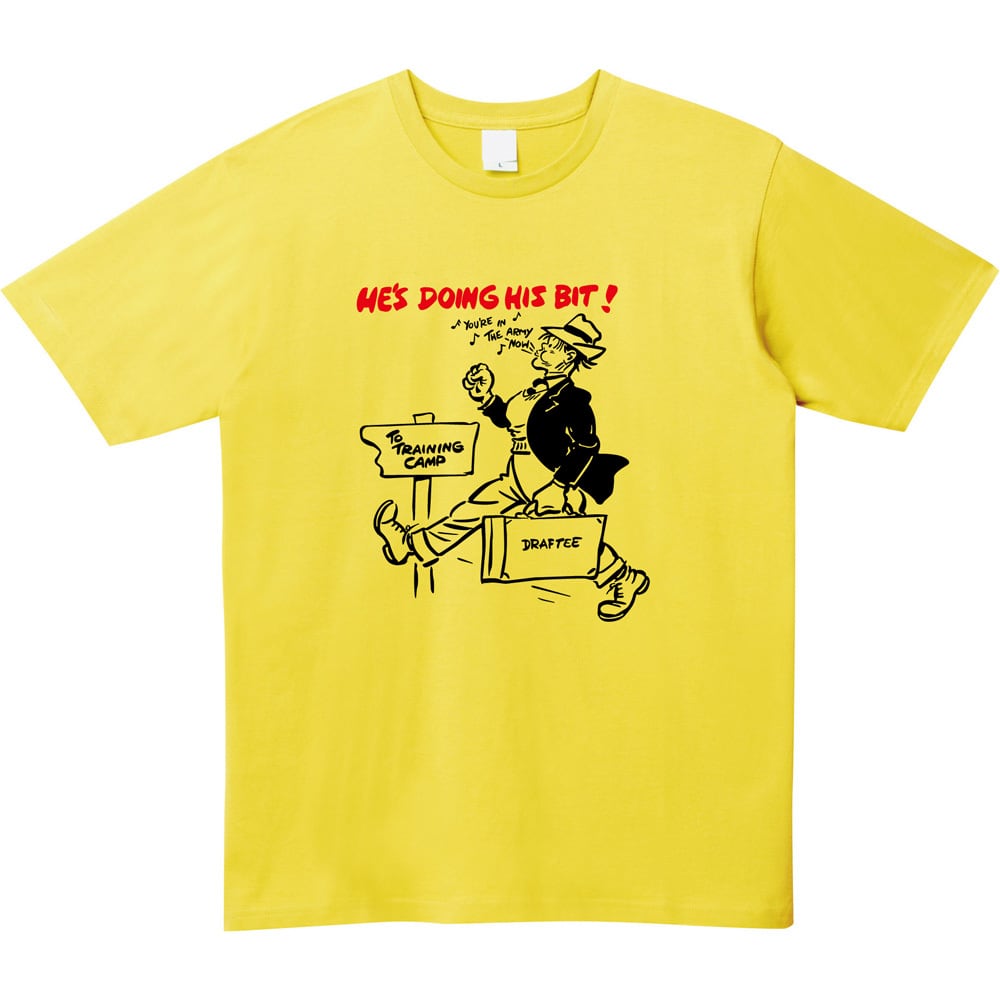 このTシャツは、第二次世界大戦中のアメリカの徴兵(Draft)制度を風刺的・肯定的に描いた、ヴィンテージコミック調のイラストをフィーチャーしています。
