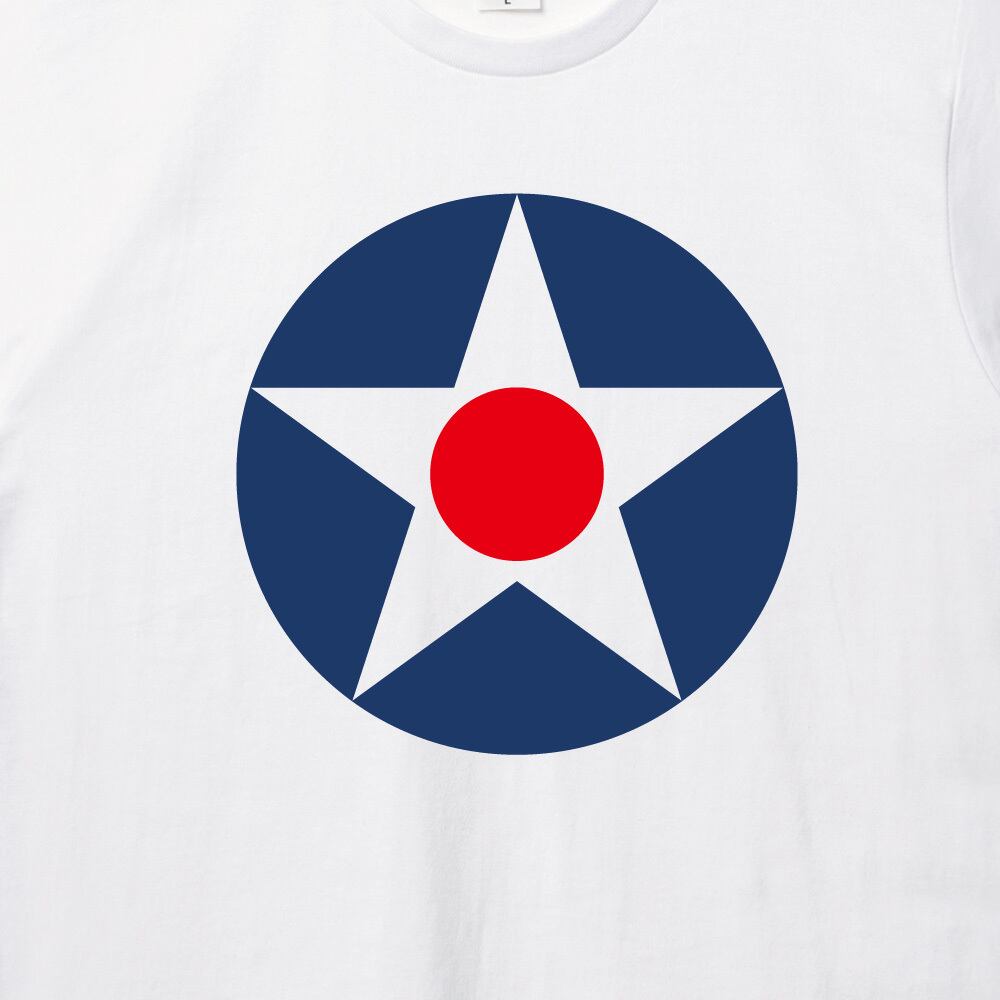 【デザインの歴史と特徴】 このTシャツにプリントされているのは、USAAFが第二次世界大戦のごく初期、1942年5月末まで使用していた航空機の国籍マーク(ラウンドマーク)です。