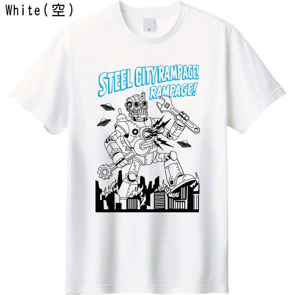 【レトロで力強い!「STEEL CITY RAMPAGE」グラフィックT】 80年代の特撮映画やヴィンテージコミックを彷彿とさせる、巨大ロボットの襲来を描いたオリジナルTシャツです。