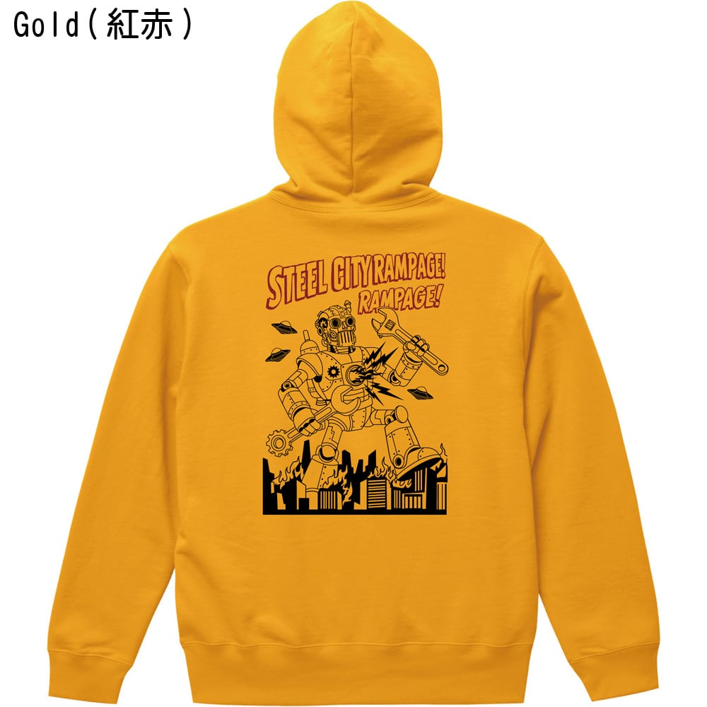 【主役級の存在感!「STEEL CITY RAMPAGE」裏パイルパーカー】 大人気の「レトロロボット 巨神襲来」デザインに、待望のプルオーバーパーカーが登場しました。