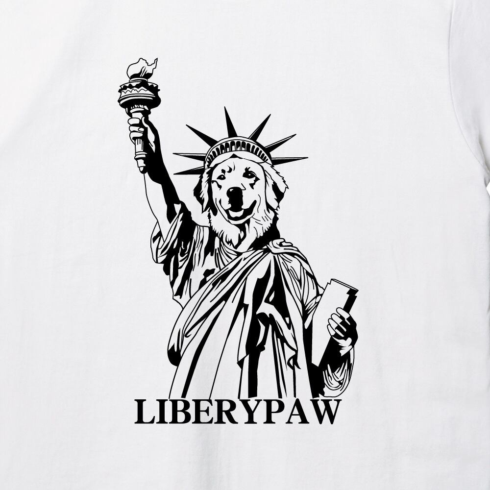 自由の女神とゴールデンレトリバーをミックスした、遊び心あふれるパロディTシャツです。