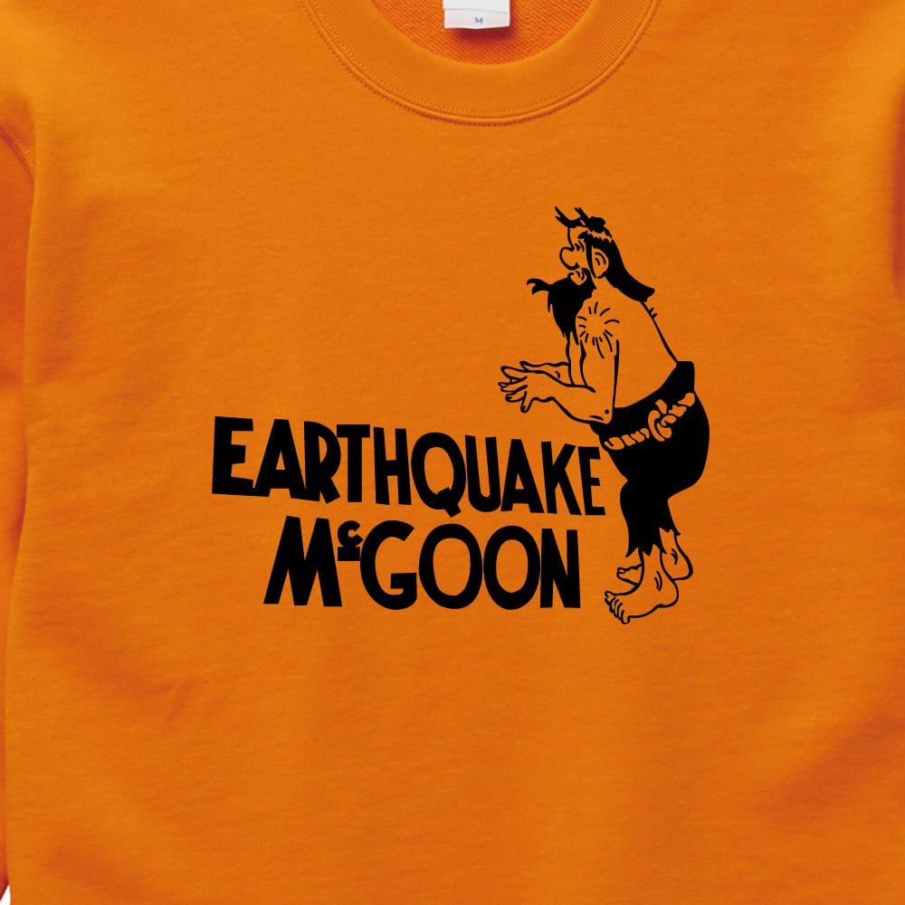 唯一無二の存在感: 当時の人気漫画『リル・アブナー』の怪力キャラ「アースクエイク・マグーン」を大胆にプリント。