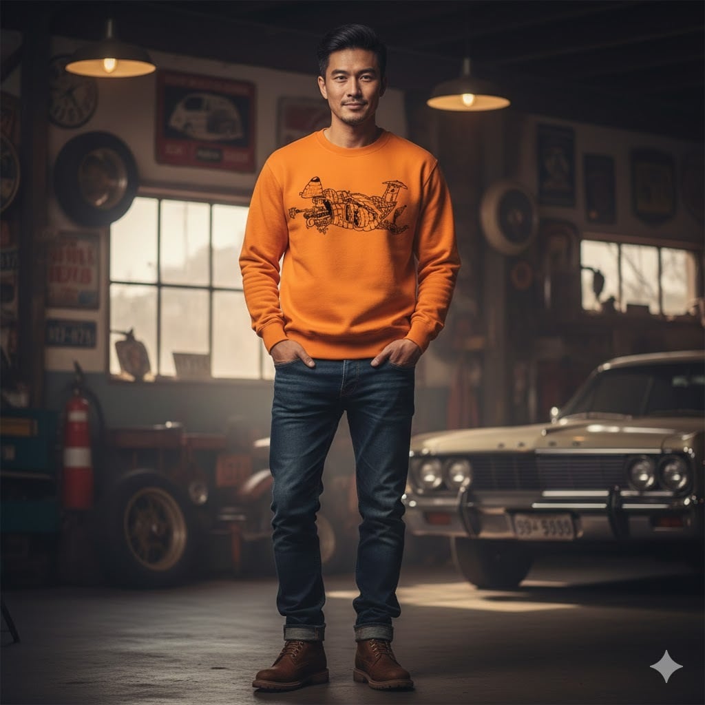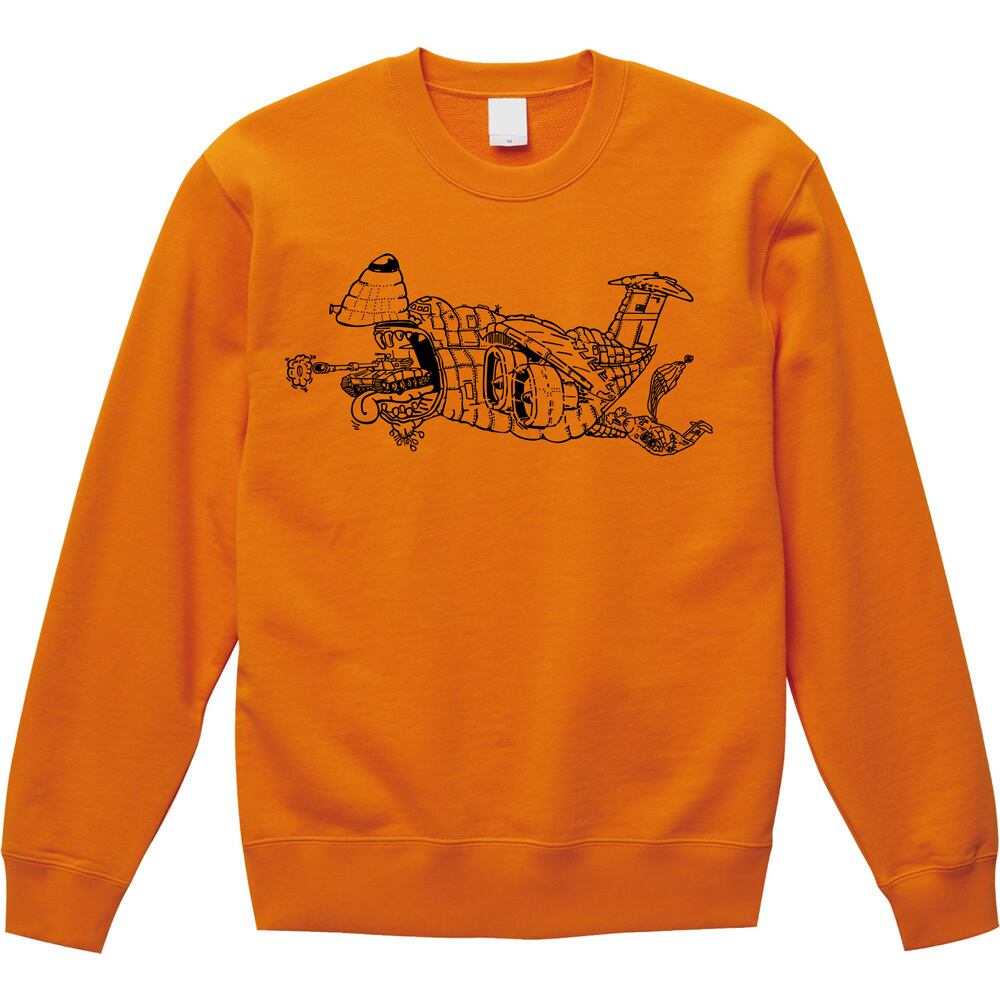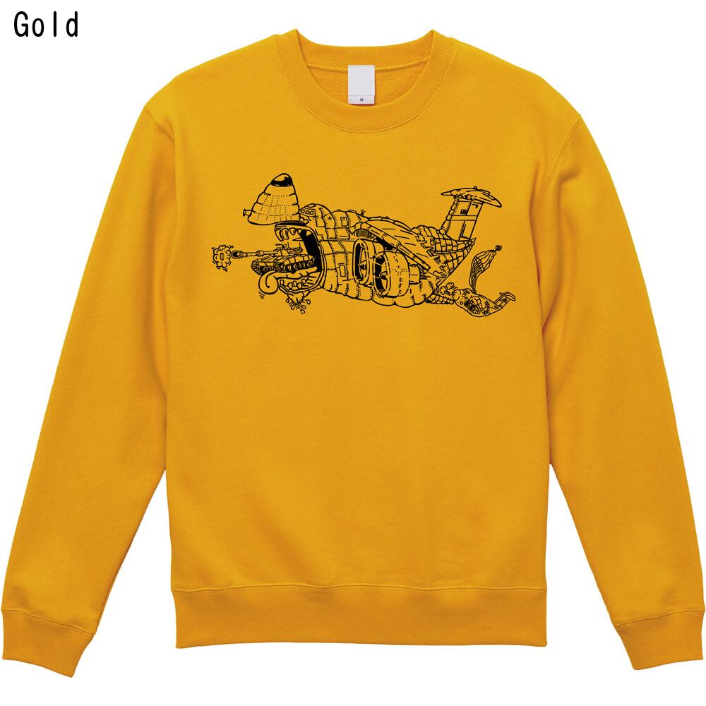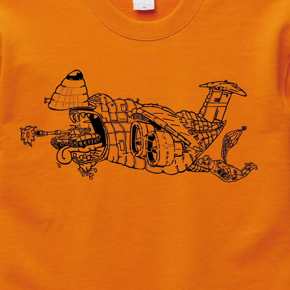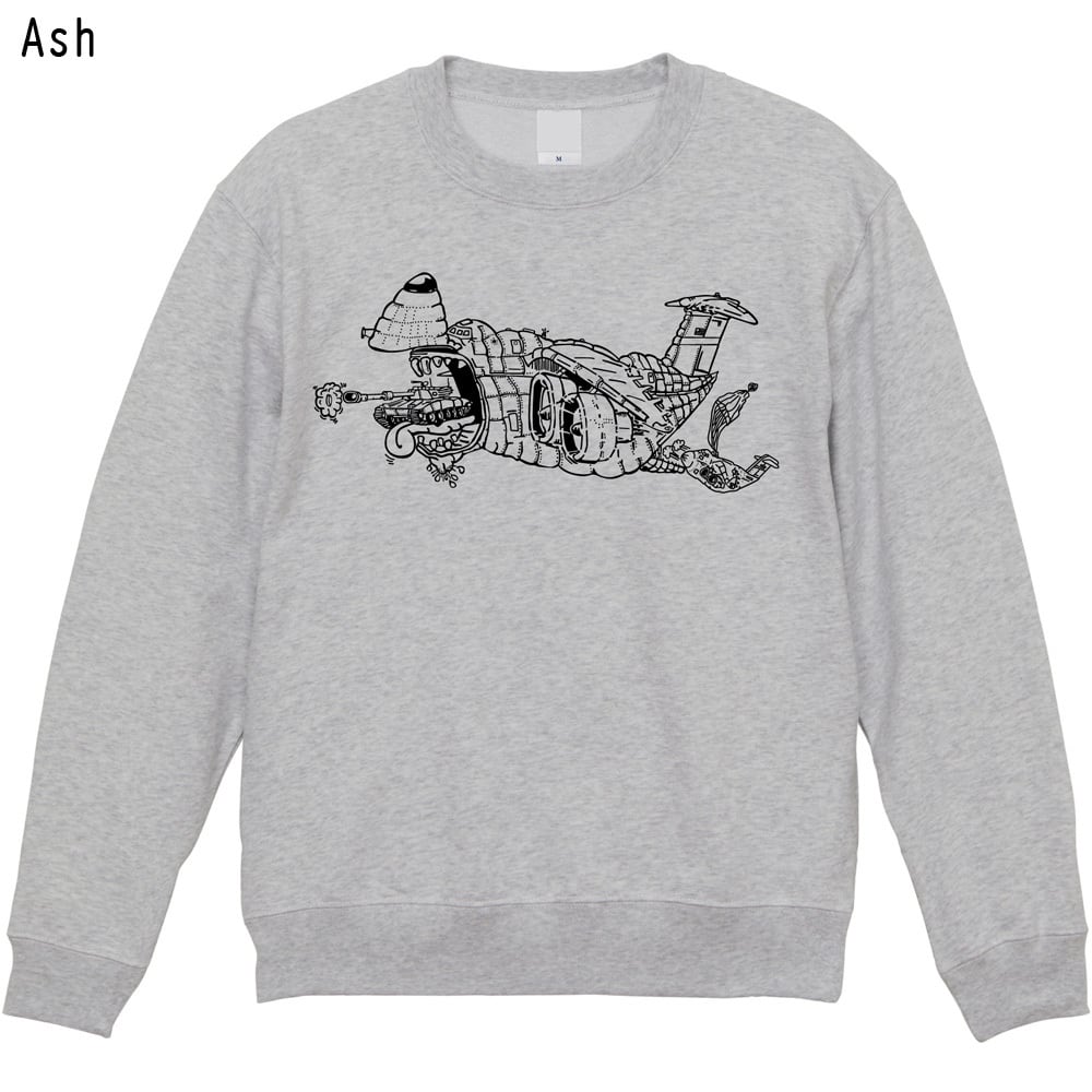 機首から戦車を飲み込み、後部から小型機を排出するコミカルで強烈なインパクトは、スウェットの柔らかな生地感とも相性抜群です。