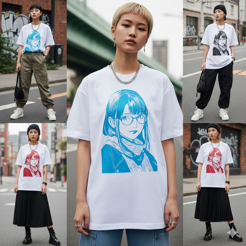 都会的な空気を纏った「シティガール」を、力強いラインアートで描き出したオリジナルプリントTシャツです。