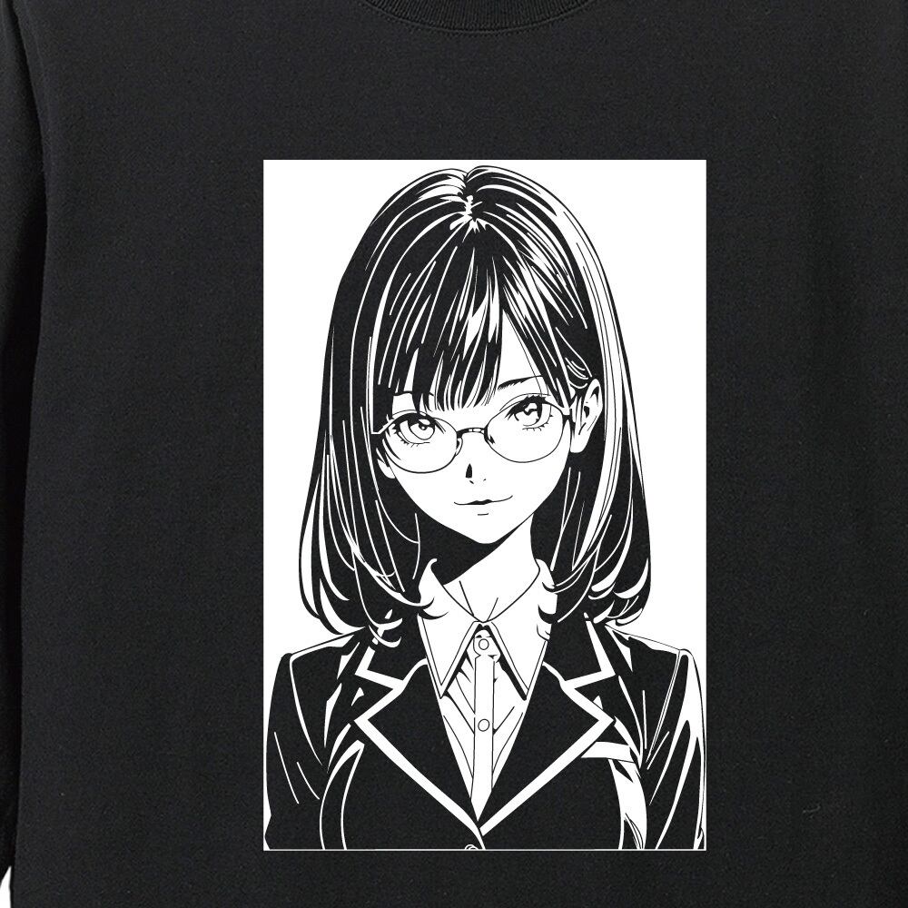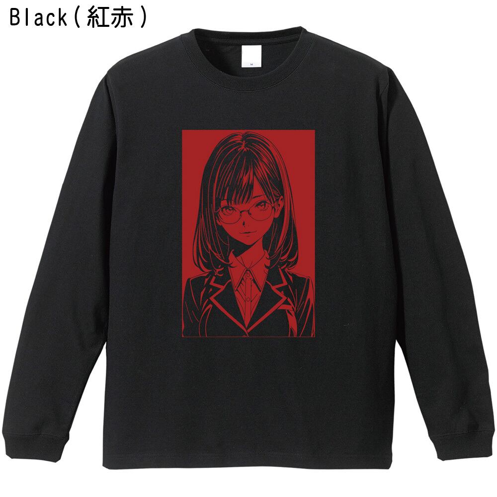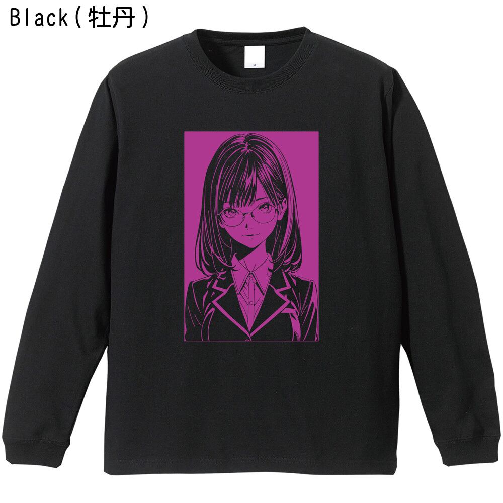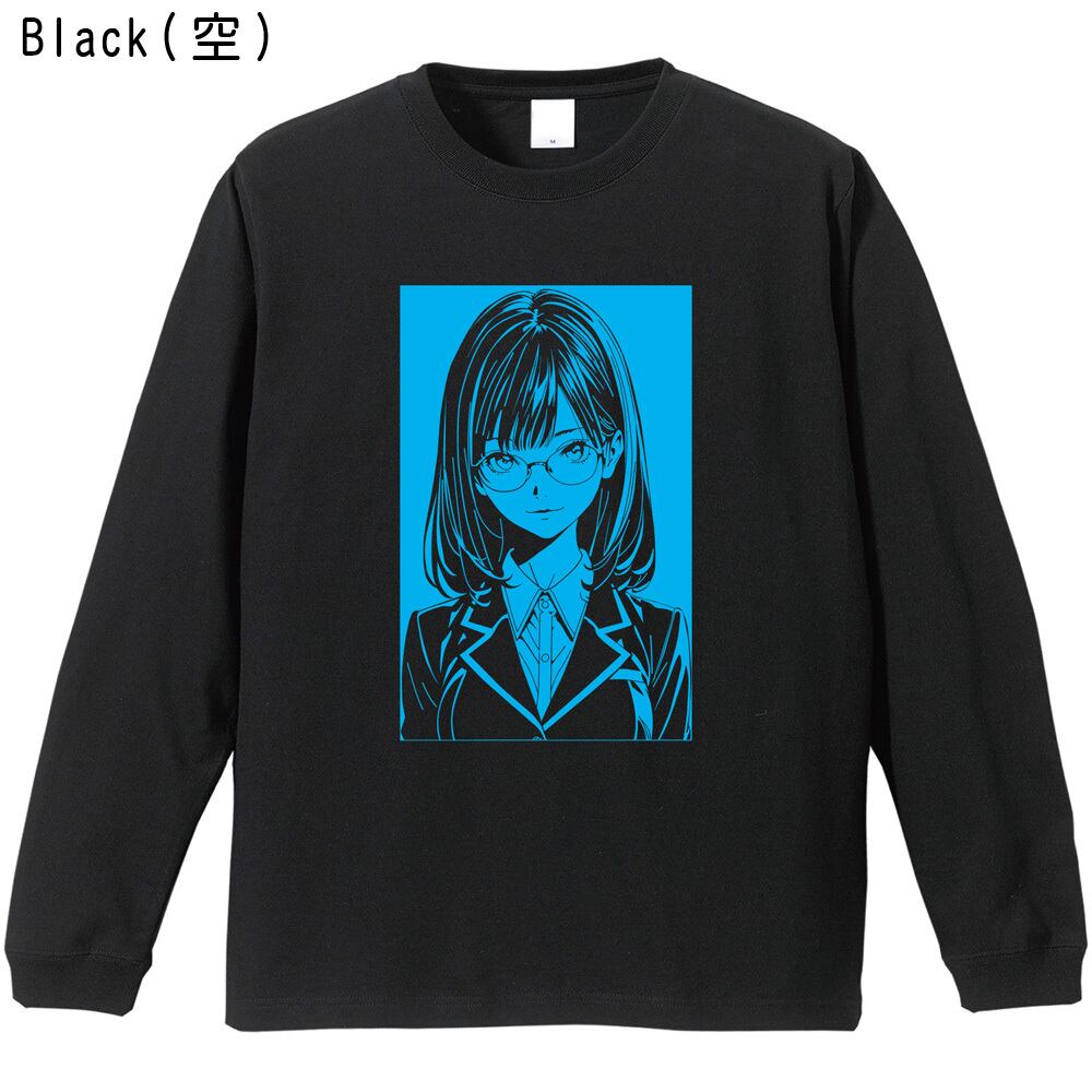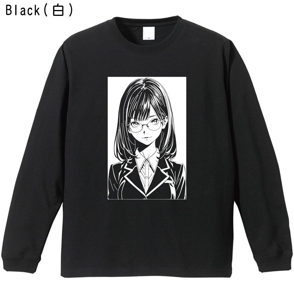 【眼鏡女子高生/全5色】笑顔 アーバン・ラインアート ロンT|シティガール エモい イラスト 長袖Tシャツ