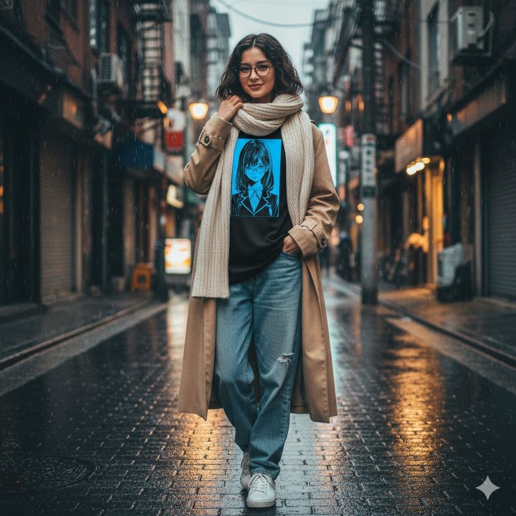 どこか懐かしさを感じさせるシティガール風のタッチを、繊細な線画で表現しました。主張しすぎないのに目を引く、エモーショナルな空気感を纏った一着です。