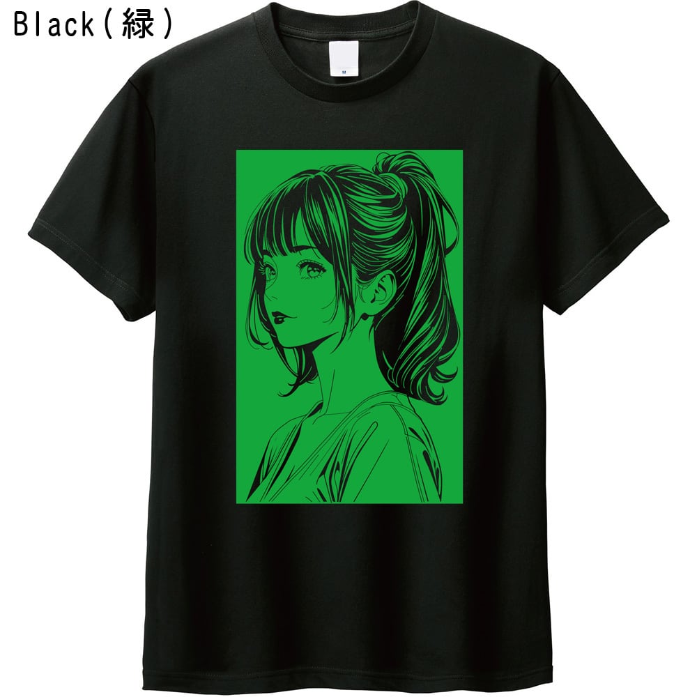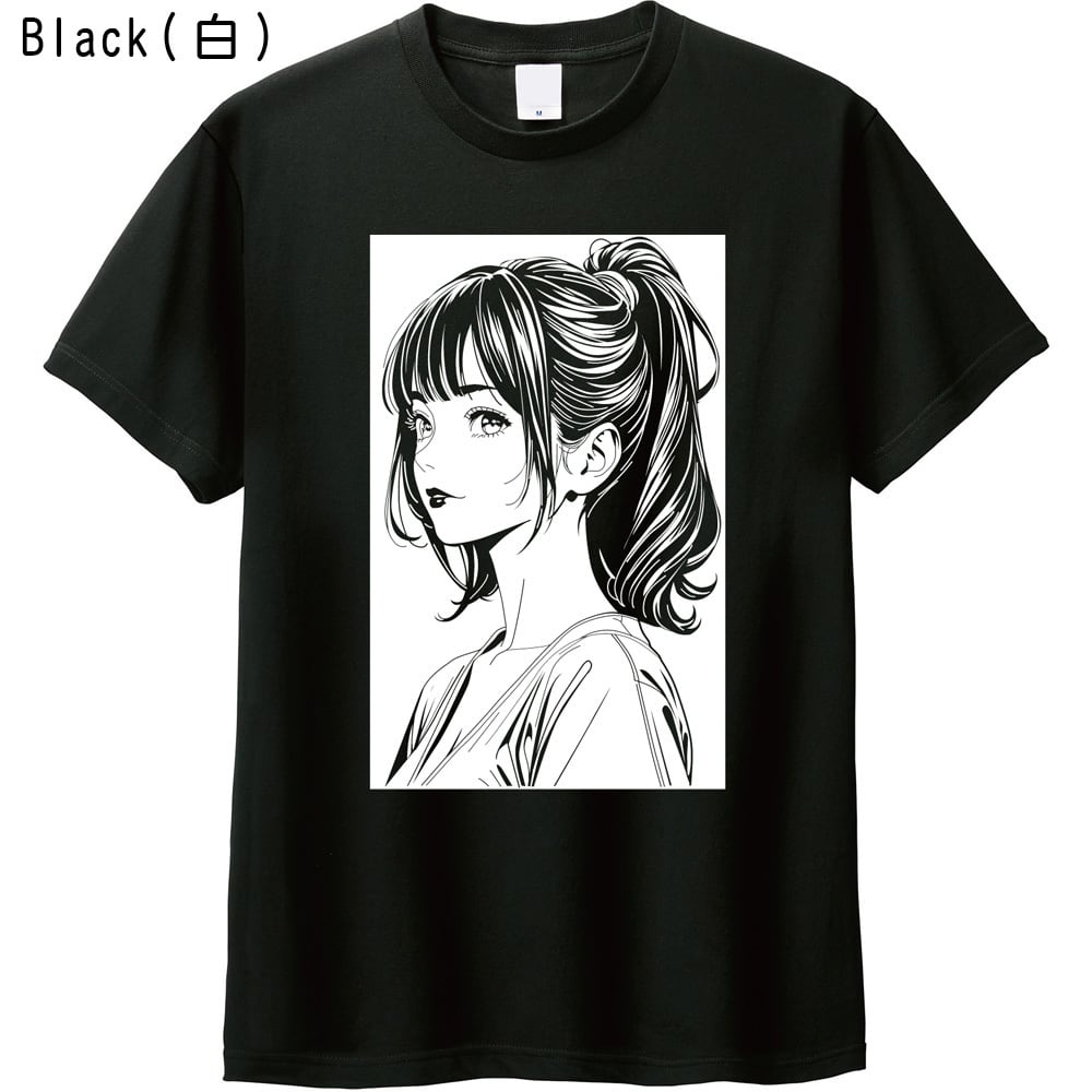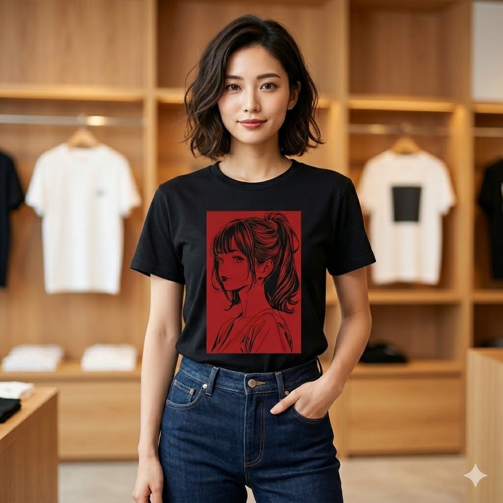 80年代のシティポップを彷彿とさせる、アンニュイな女性の表情を繊細な線画で描き出しました。ブラックのボディに映えるスタイリッシュなプリントが、日常のコーディネートに都会的でエモい雰囲気をプラスします。
