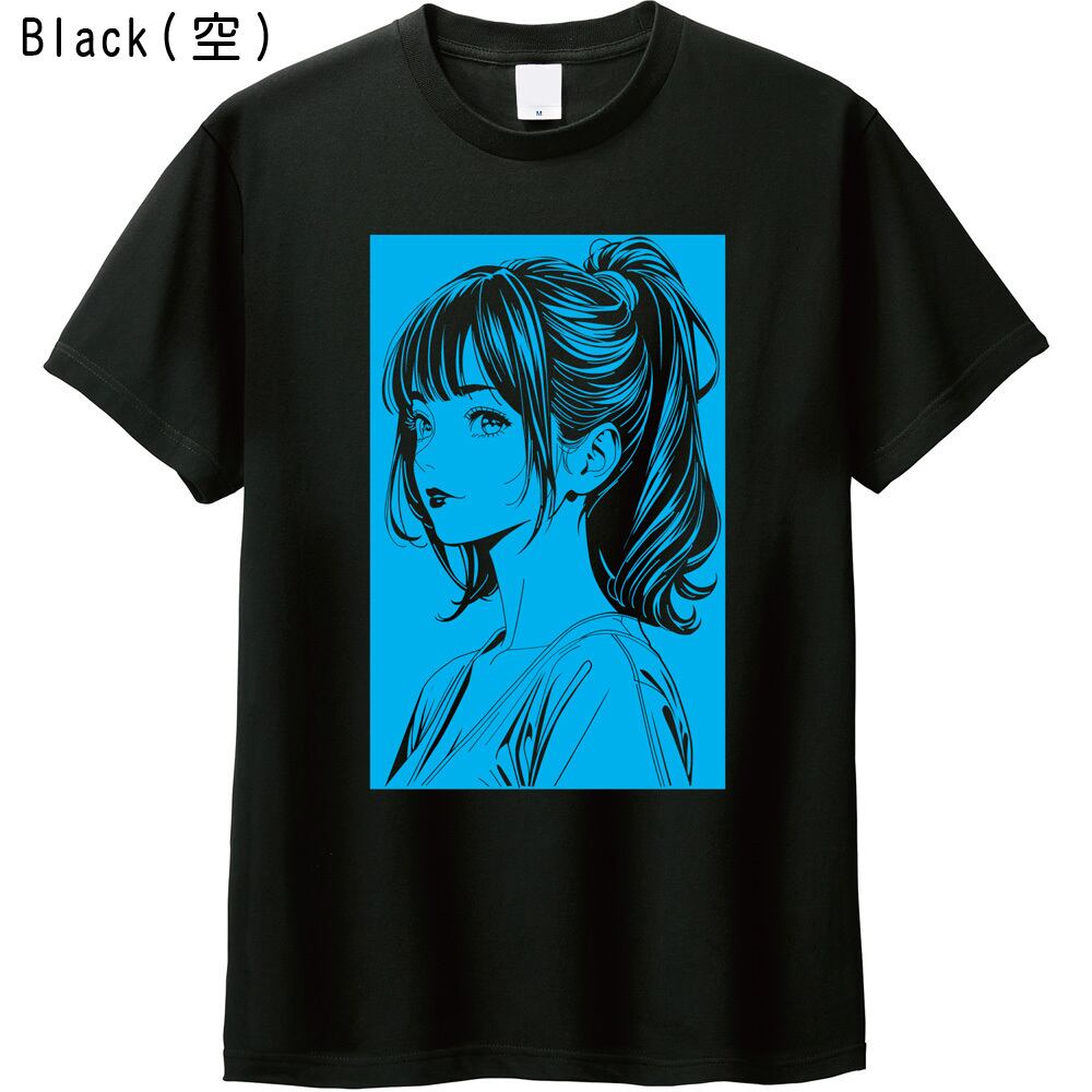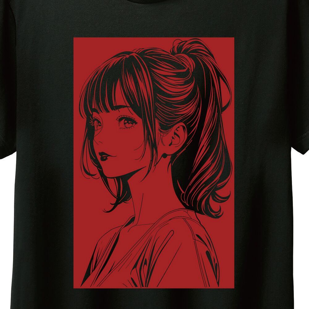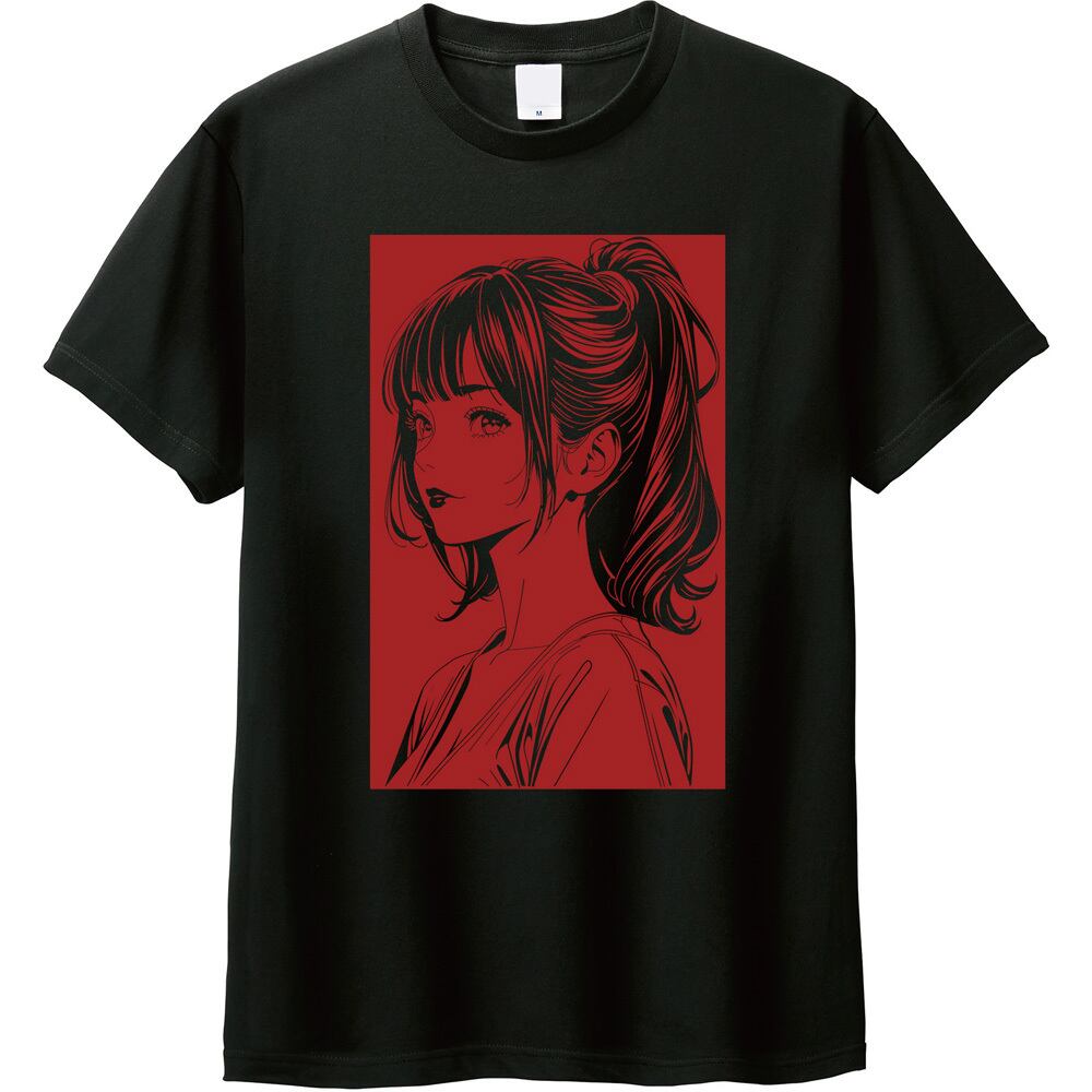 80年代のシティポップを彷彿とさせる、アンニュイな女性の表情を繊細な線画で描き出しました。ブラックのボディに映えるスタイリッシュなプリントが、日常のコーディネートに都会的でエモい雰囲気をプラスします。