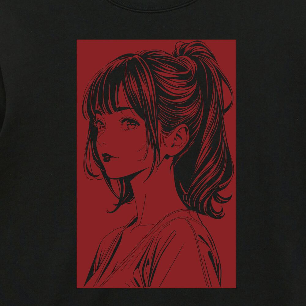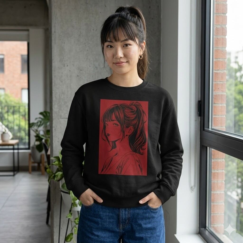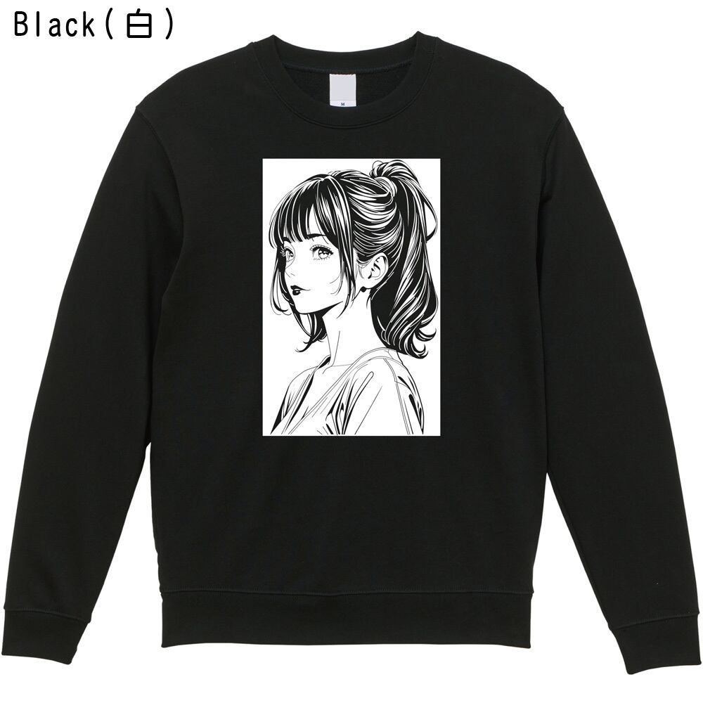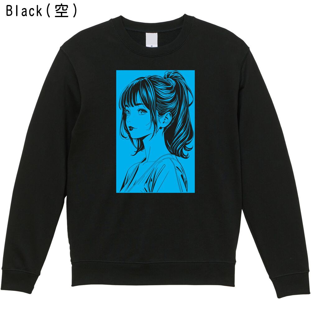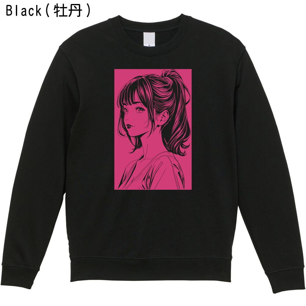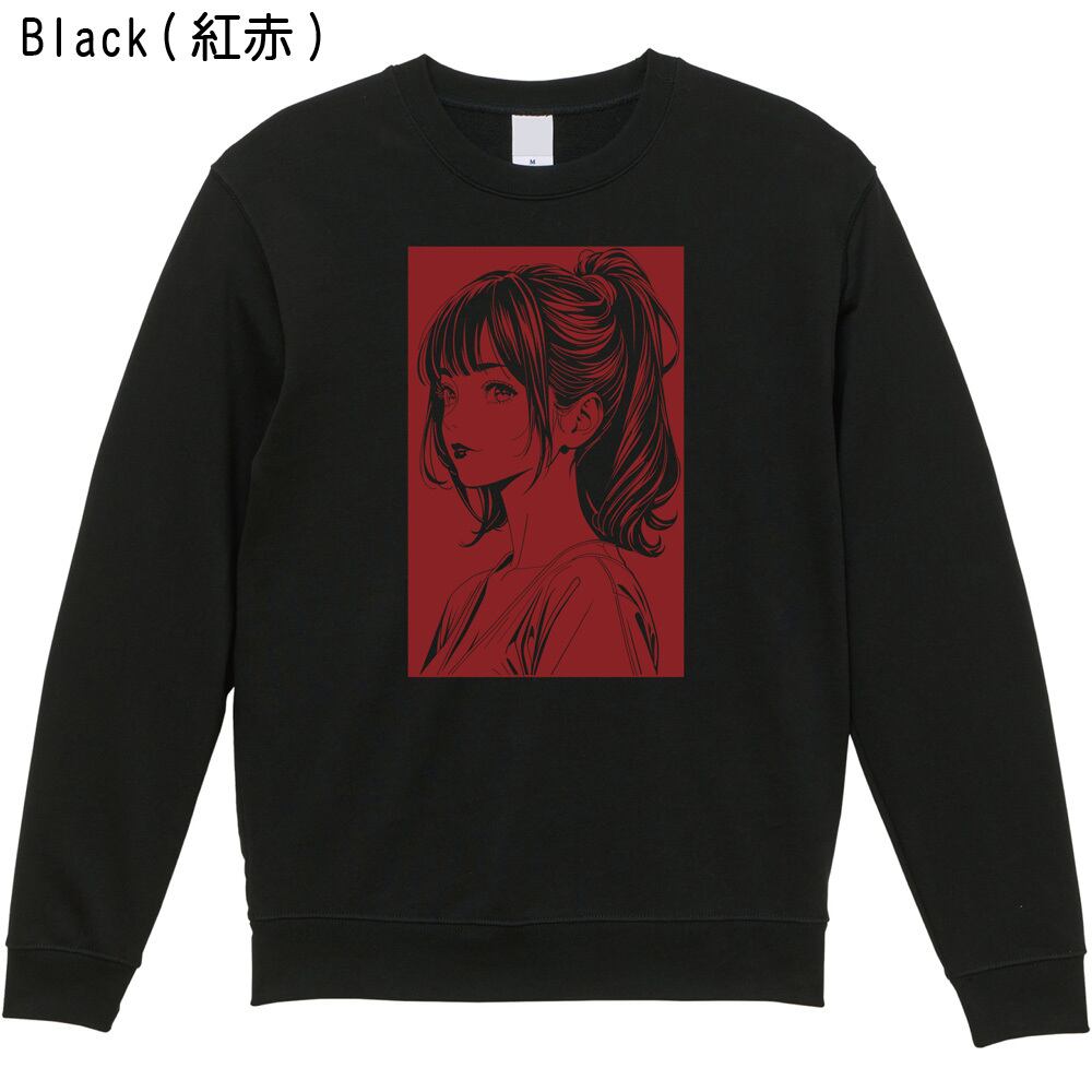 ブラックのスウェットボディに映えるスタイリッシュなプリントが、都会的で「エモい」雰囲気を演出。トレーナー特有のゆったりとしたシルエットが、デザインの持つアンニュイなムードをさらに引き立てます。