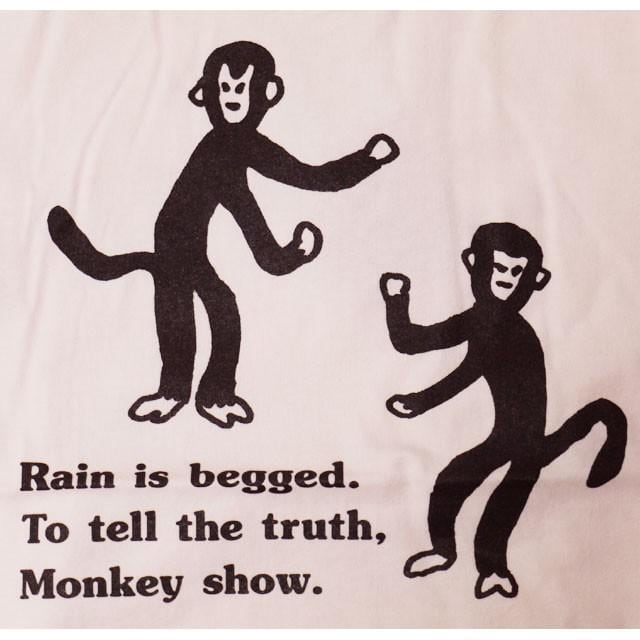 「Rain is begged.(雨乞い)」「Monkey show.」という謎めいた英文メッセージが添えられ、一度見たら忘れられない個性を放ちます。