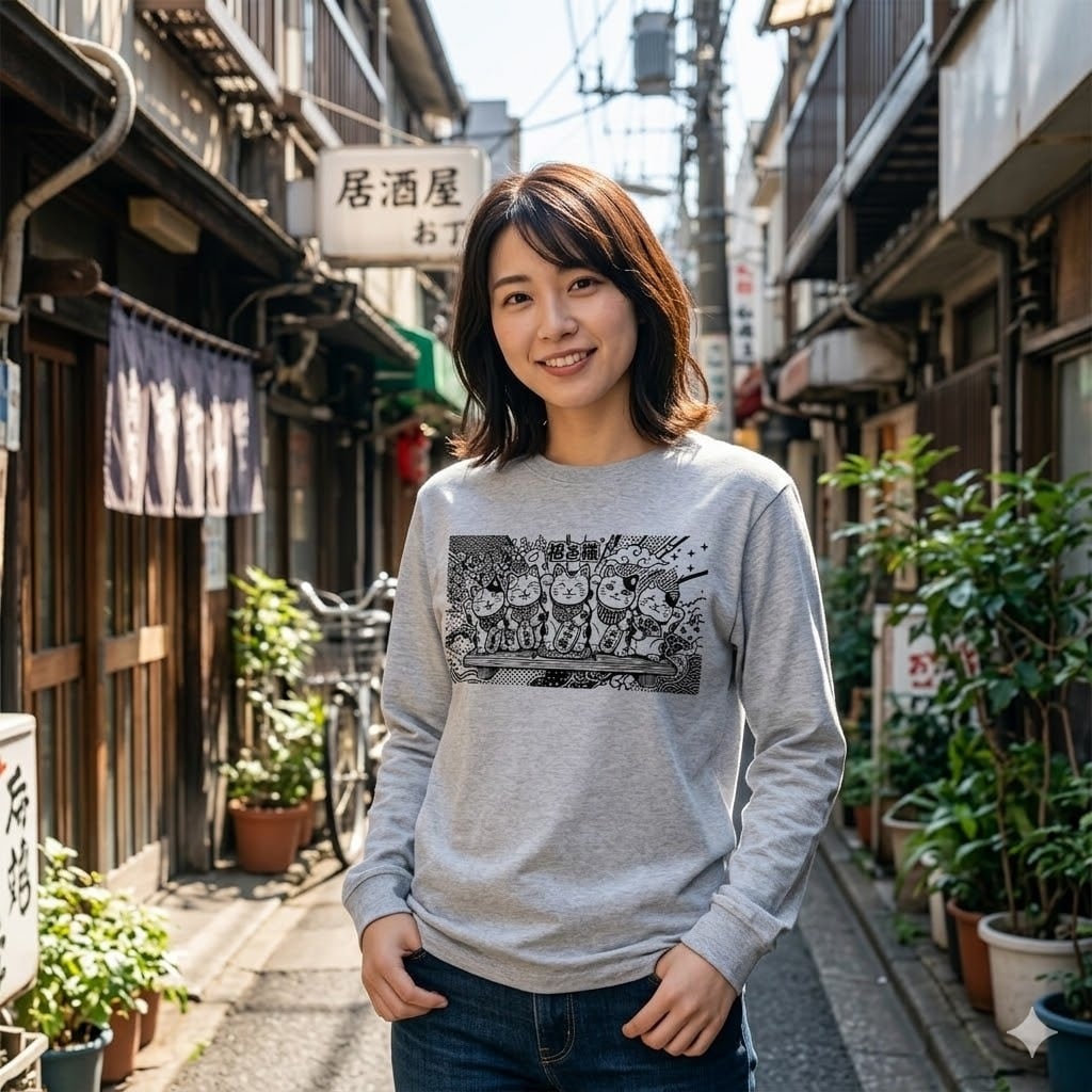 レイヤードスタイル:ベストやコーチジャケットのインナーとして着用。フロントのインパクトある招き猫が、コーディネートのアイコニックなアクセントになります。