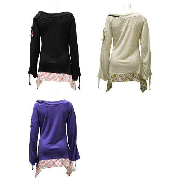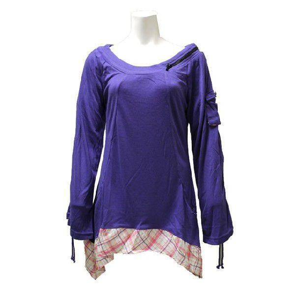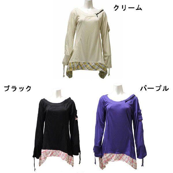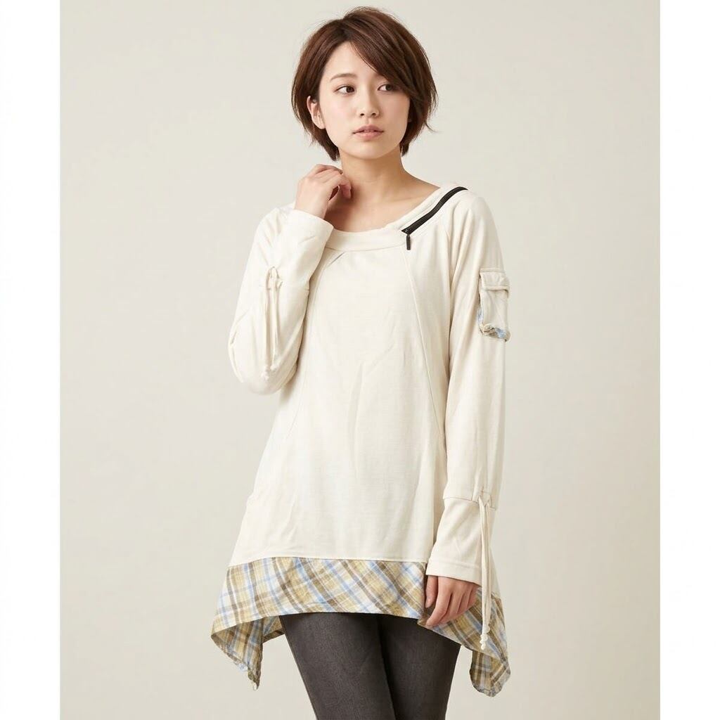 【在庫限り/全3色】アシンメトリー チェック柄 切替 トップス 長袖 変形 裾 チュニック ジップ デザイン カジュアル プルオーバー