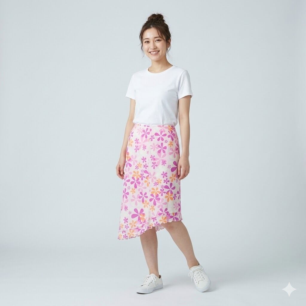 「計算されたアシメ裾」:左右で長さが異なるデザインが、単調になりがちな夏コーデにリズムを生み出します。