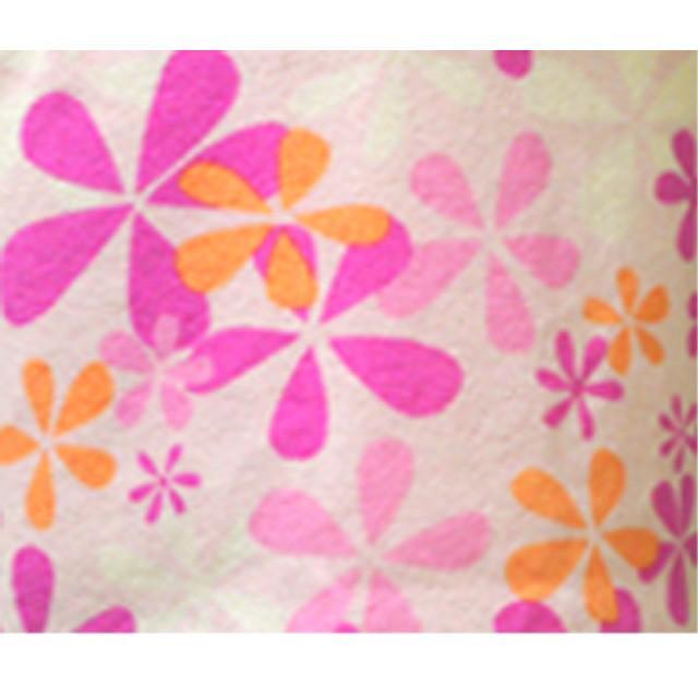 鮮やかなピンクとオレンジの花々が咲き誇る、心躍るデザインの一枚。