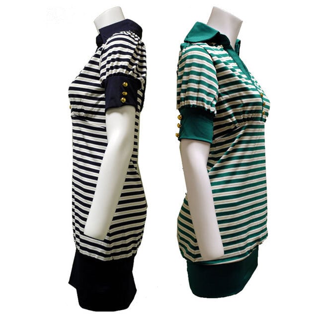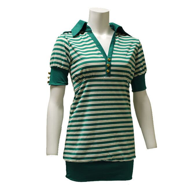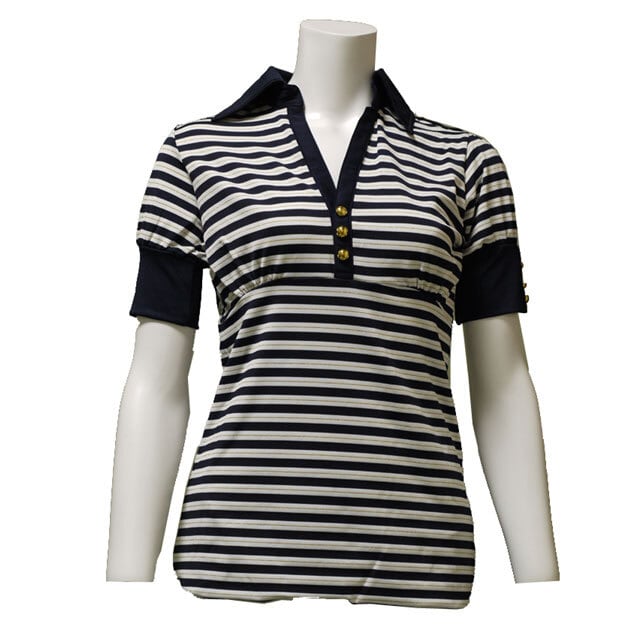 【在庫限り/2色】バックオープン ボーダー柄 ポロ チュニック 半袖 Vネック ゴールドボタン マリンスタイル パフスリーブ リブ切替 カットソー トップス