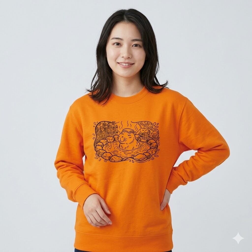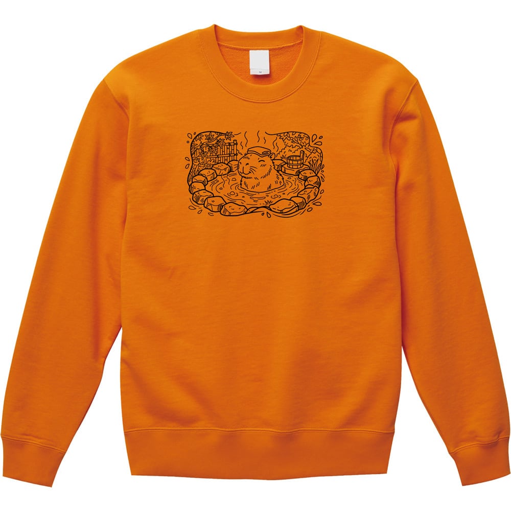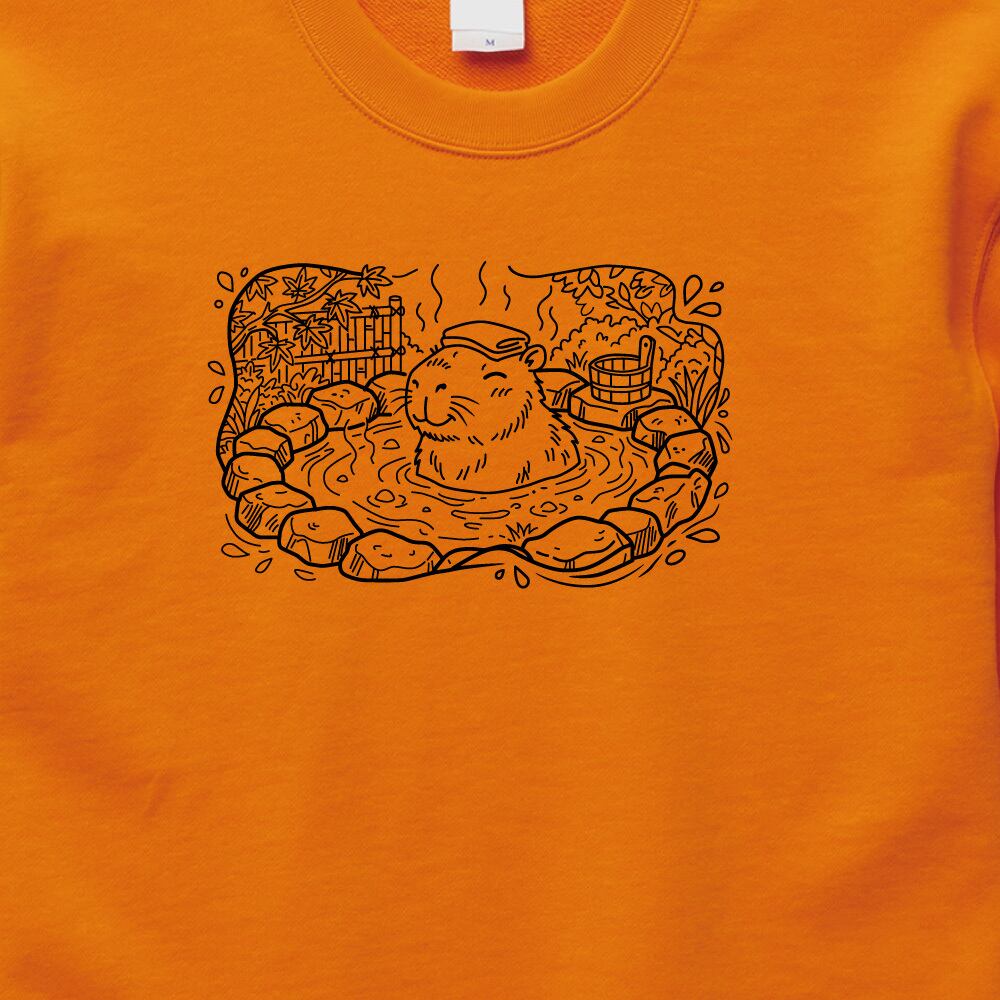 露天風呂でほっこり温まるカピバラを描いた、オリジナルイラストのスウェットトレーナーです。