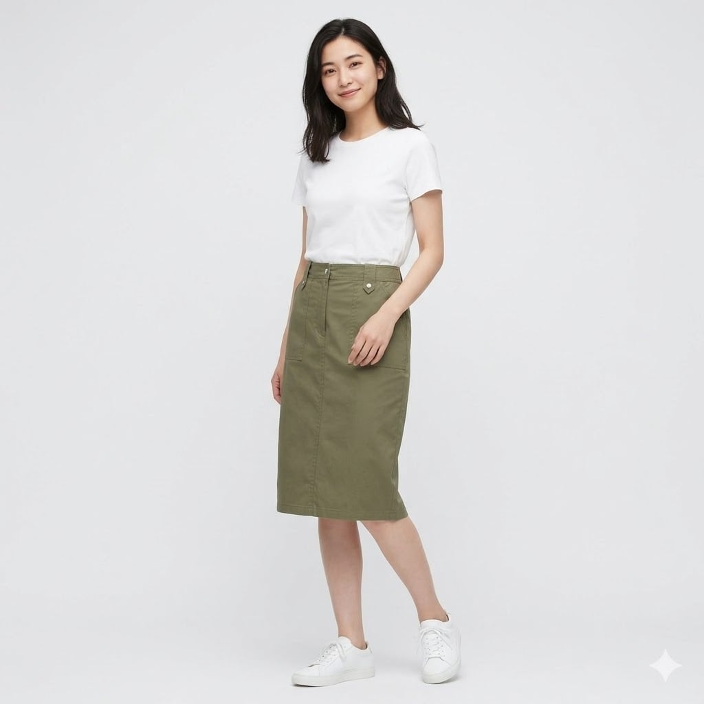 白のTシャツやリブニットをタックインし、白のスニーカーを合わせることで、清潔感のある大人カジュアルが完成します。