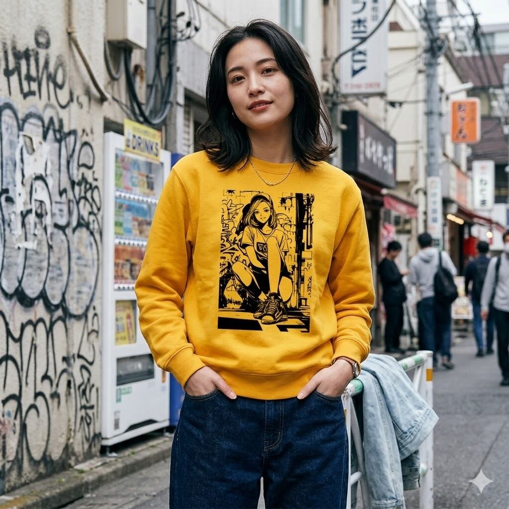 スニーカー×キャップのアニメ調女子と、ストリート感溢れる背景が融合。