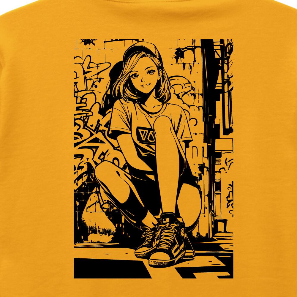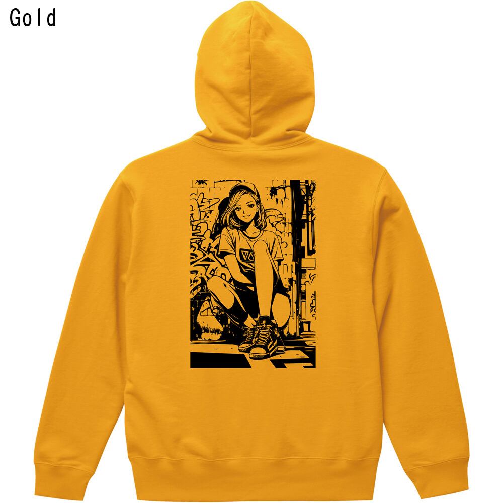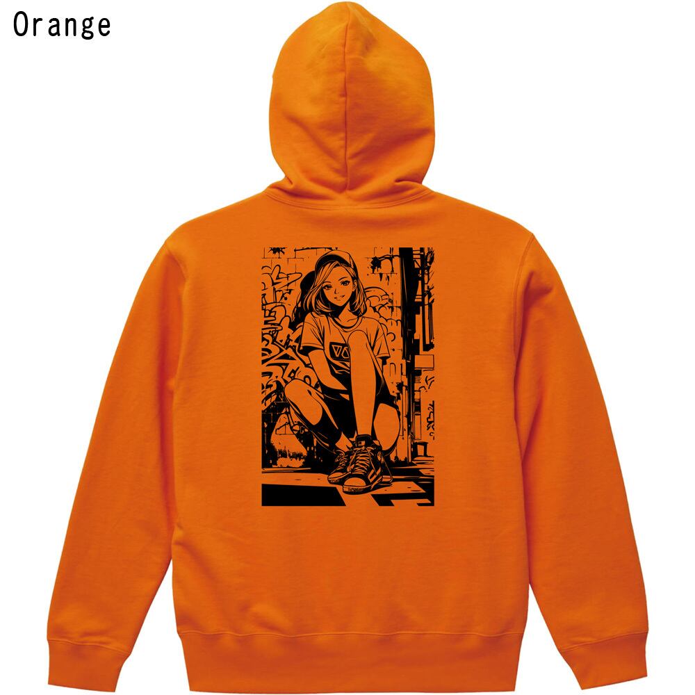 都会的なグラフィティ背景と、キャップスタイルの女の子を描いた大人気イラストが、待望のバックプリントパーカーとして登場。
