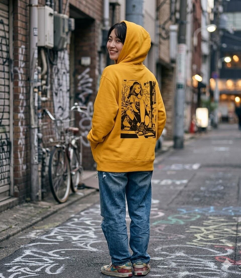 背中に大きく配置されたアートワークが、ストリートでの存在感を放ちます。