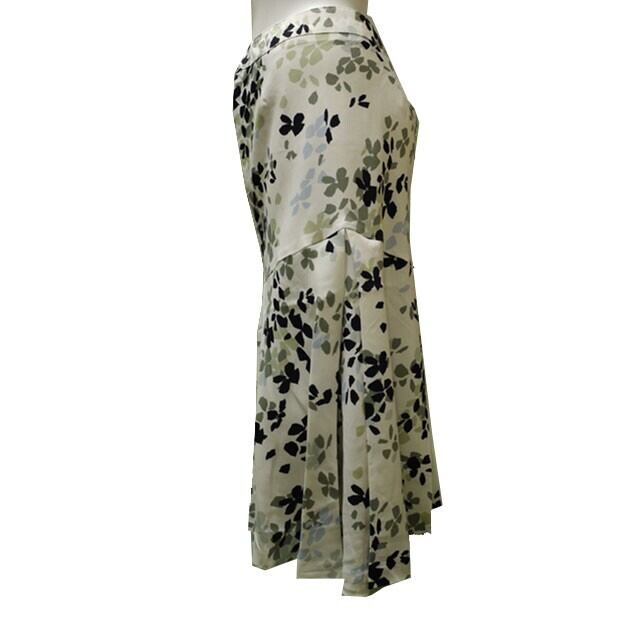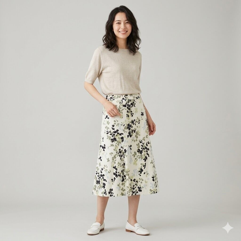 落ち着いたトーンの花柄がエレガントな印象を与える膝下丈スカート。