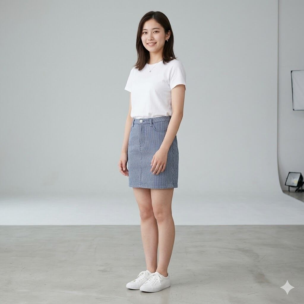 清潔感のあるホワイトをベースに、ネイビーのラインが入ったヒッコリー風カラー。どんなトップスとも合わせやすく、顔周りまで明るく見せる定番色です。