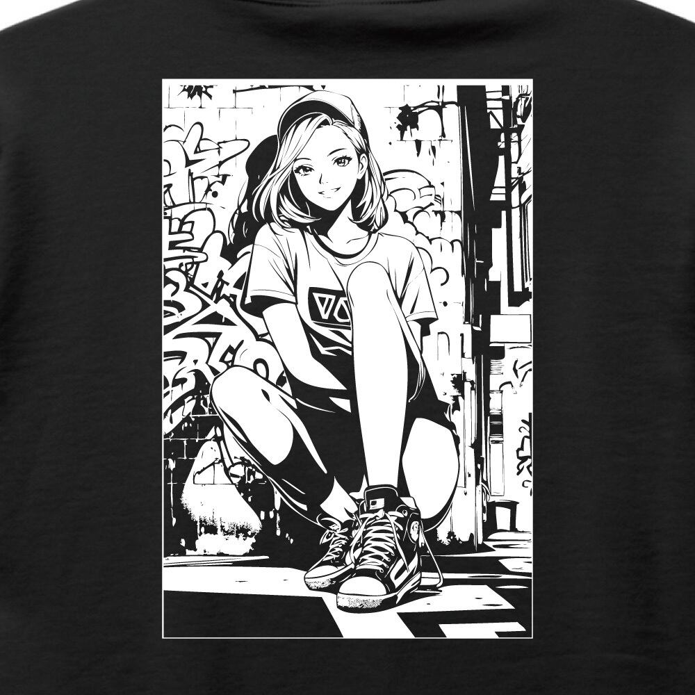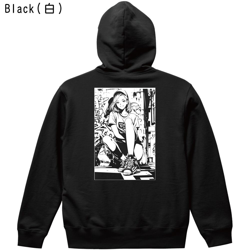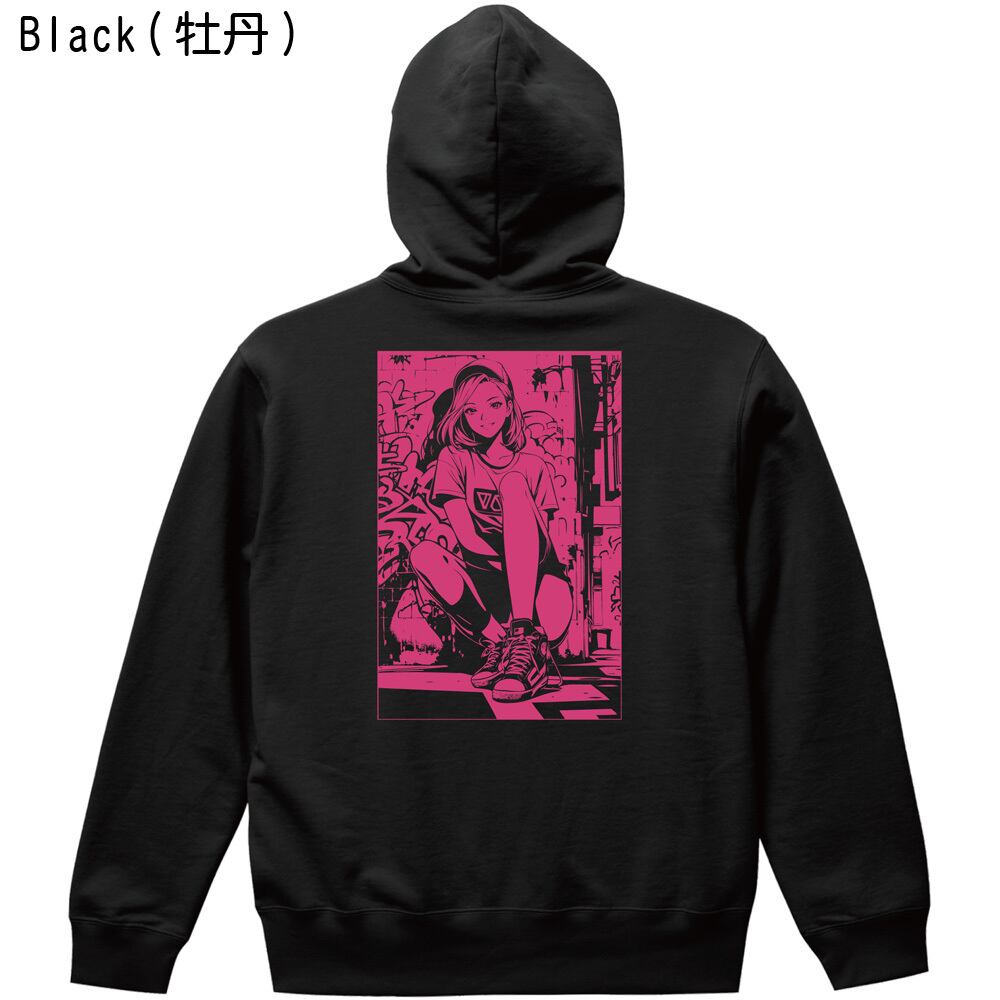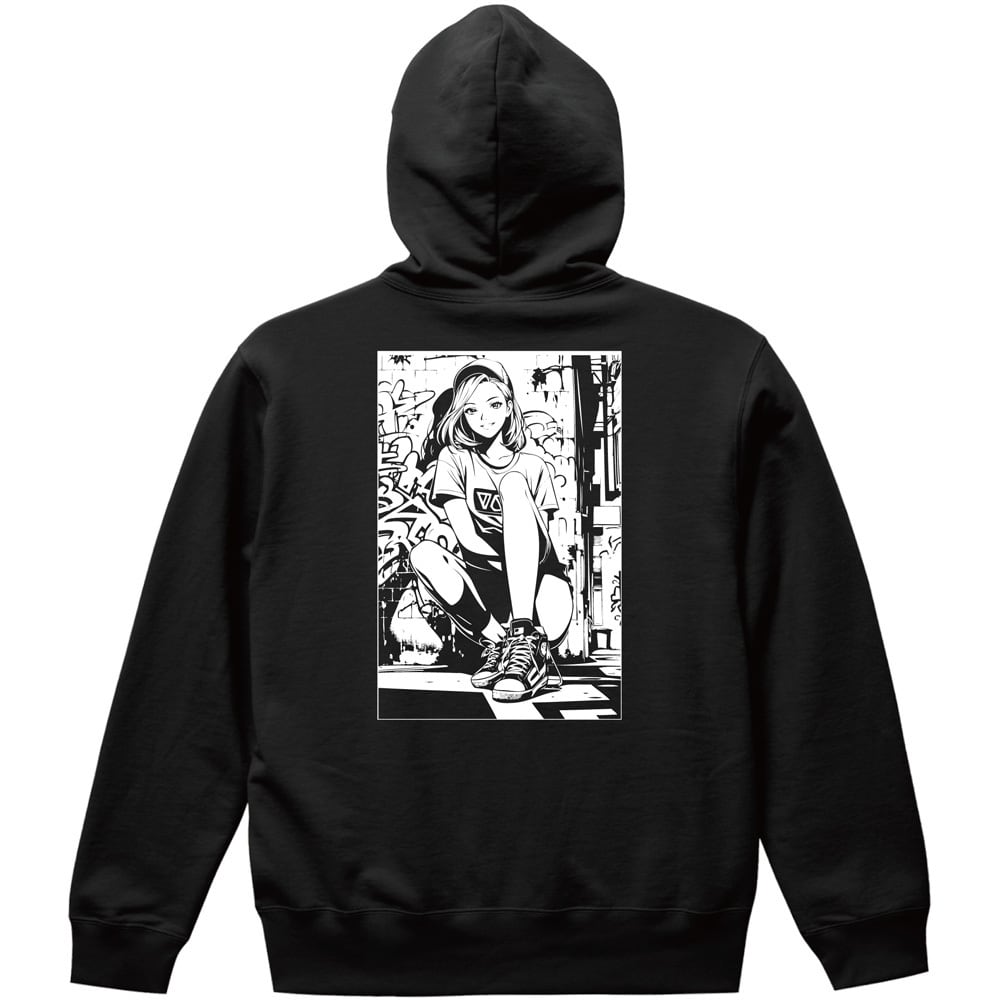 都会的なグラフィティ背景と、キャップスタイルの女の子を描いた大人気イラストが、待望のバックプリントパーカーとして登場。