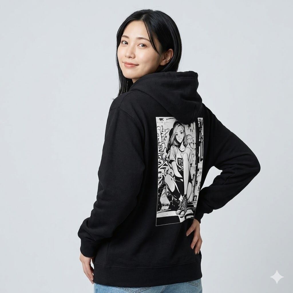 背中に大きく配置されたアートワークが、ストリートでの存在感を放ちます。