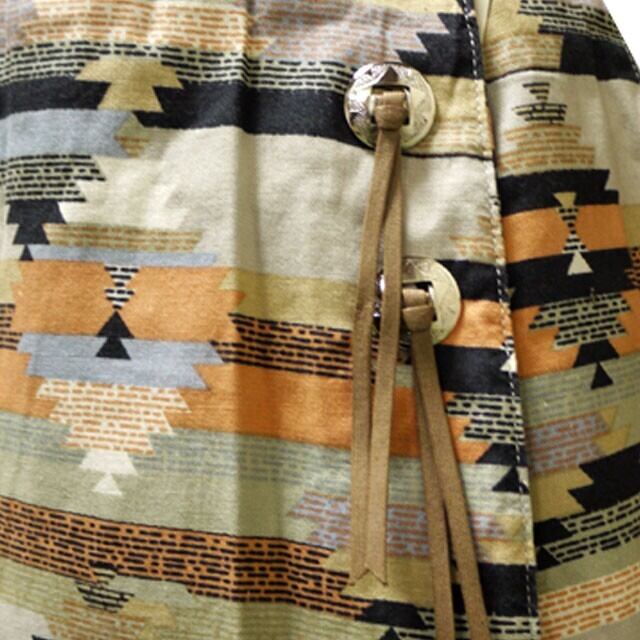 落ち着いたベージュをベースに、テラコッタ、ブラック、グレーの糸で織りなされたネイティブパターン。派手すぎず、大人のカジュアルスタイルに馴染む配色です。