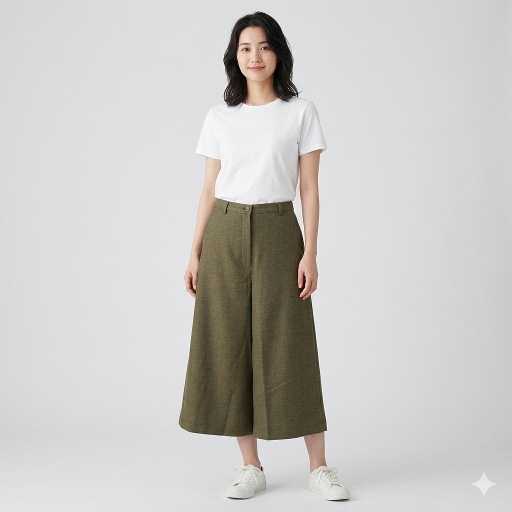 絶妙な丈感: 着丈75cmのガウチョ・キュロット丈で、足首をスッキリ見せつつ、脚のラインを拾わない体型カバー効果も抜群。