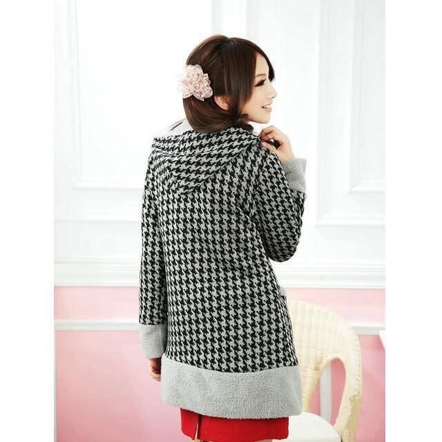 クラシックな千鳥格子柄に、カジュアルなフードをプラス。内側は全面ボア(または厚手の裏地)になっており、寒い日のお出かけも快適です。