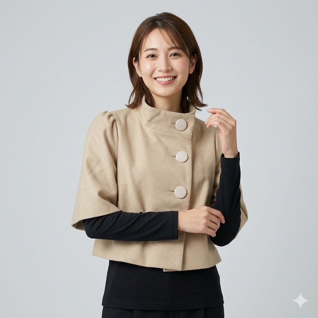 軽やかなウールライク素材:レーヨン混のしなやかな生地感で、季節の変わり目のライトアウターとして重宝します。