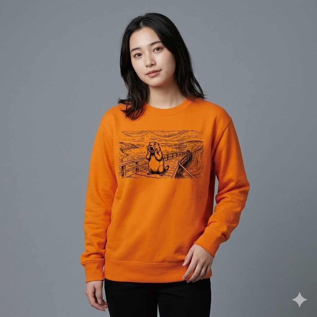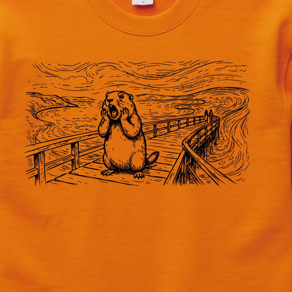 世界的な名画「ムンクの叫び」を、愛くるしいマーモットで再現したシュールなパロディスウェット(トレーナー)です。