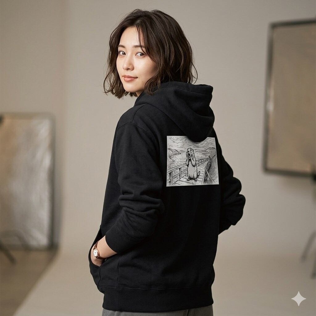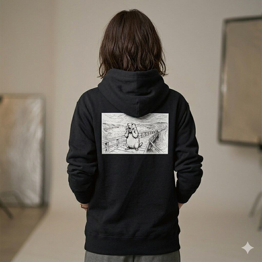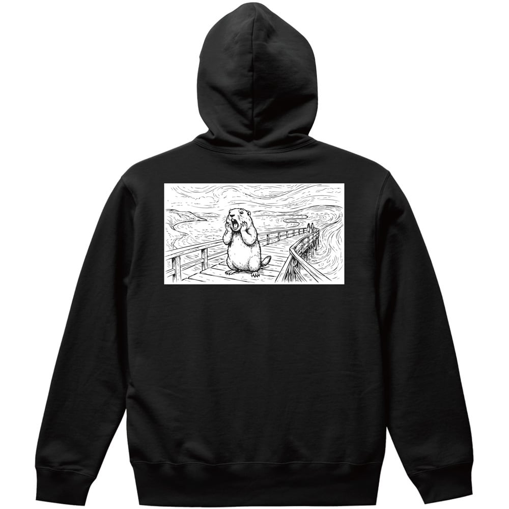 背中で絶叫。ムンク風マーモットの黒パーカー