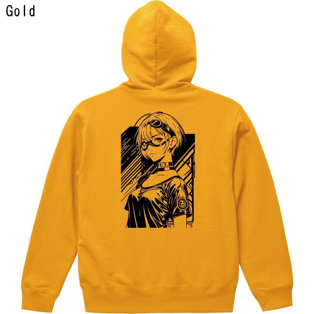 サイバーパンクな眼鏡女子を背面に大胆に配した、バックプリント仕様のオリジナルプルオーバーパーカーです。