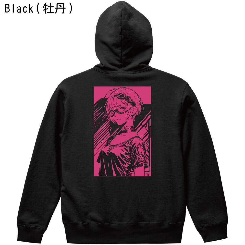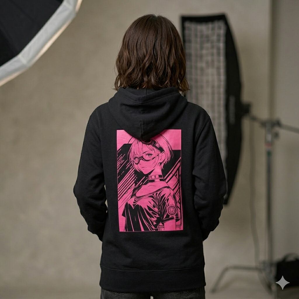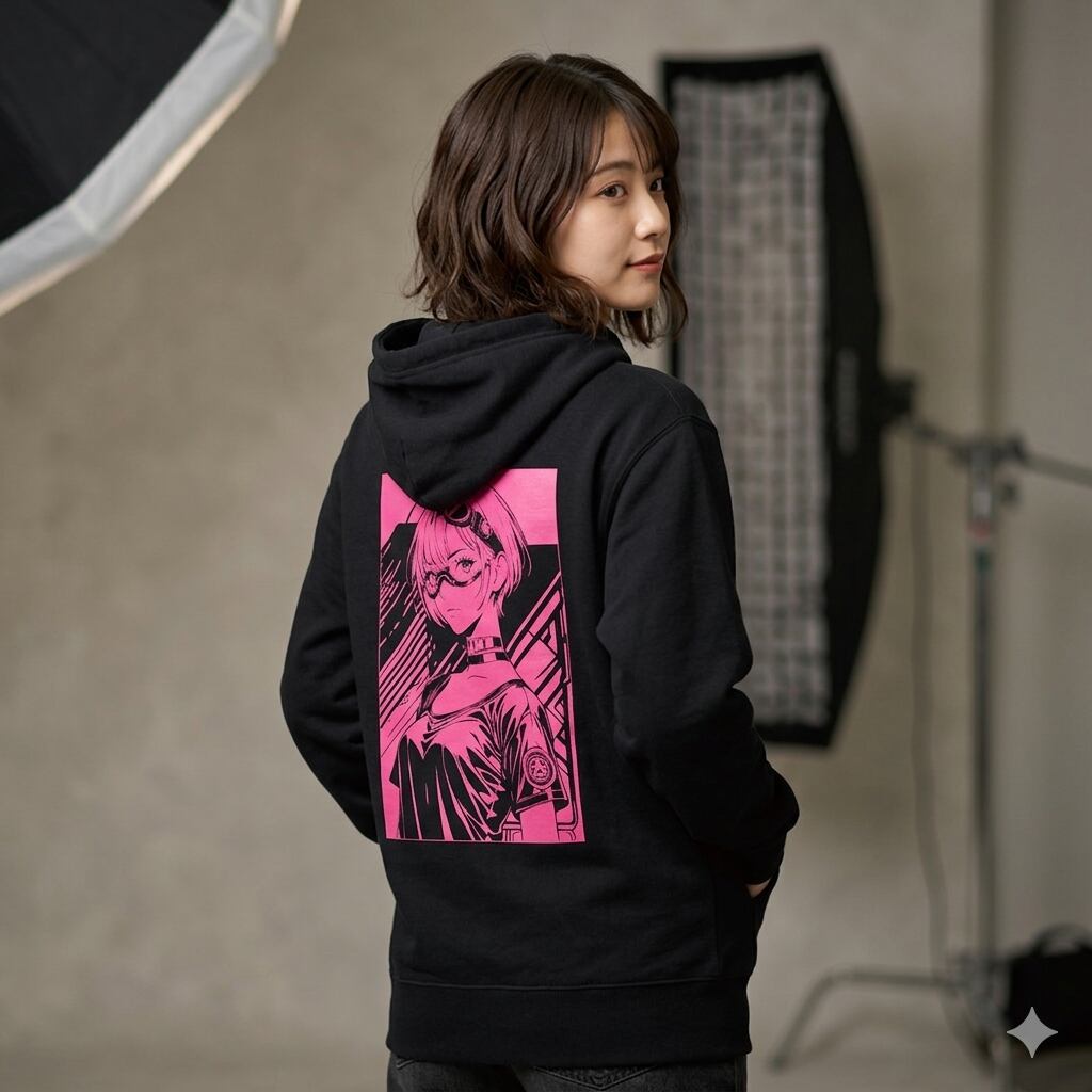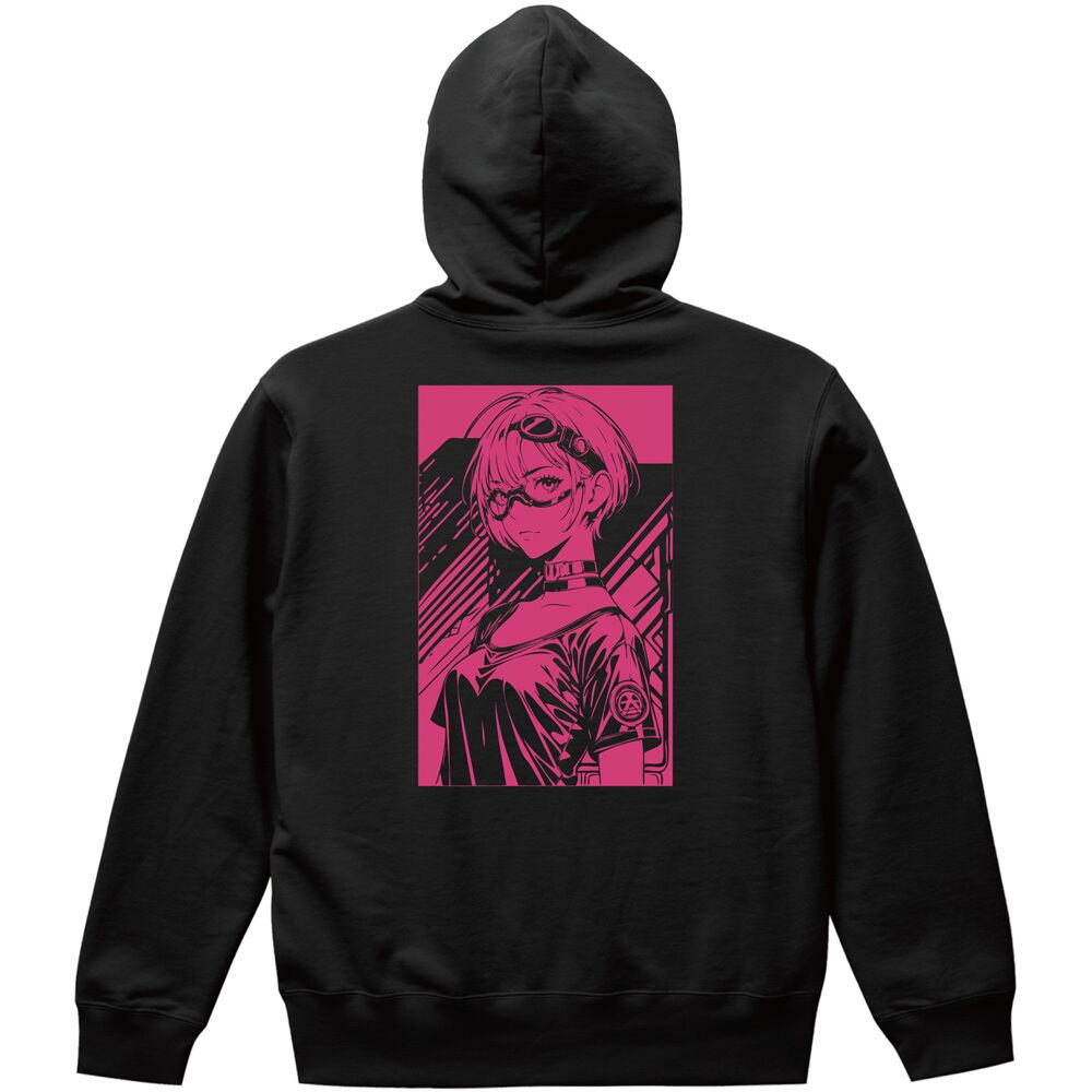 サイバーパンクな眼鏡女子のグラフィックを背面に大胆に配した、バックプリント仕様のオリジナルプルオーバーパーカーです。