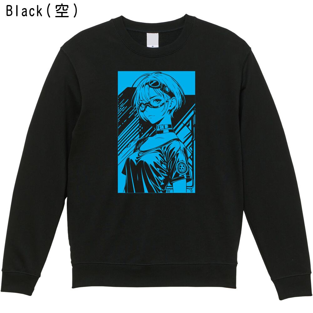 サイバーパンクな眼鏡女子をフロントに大胆に配した、前プリント仕様のオリジナルクルーネックスウェットです。