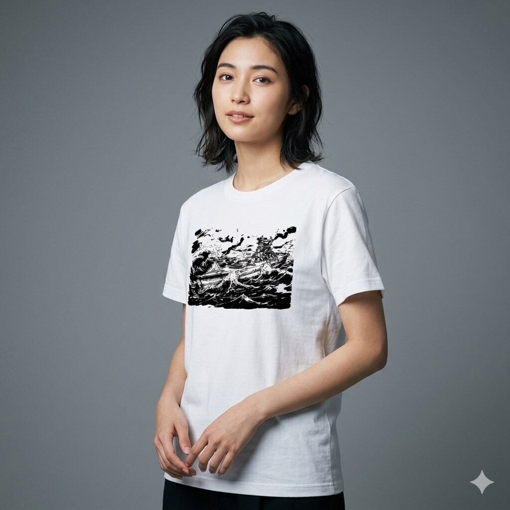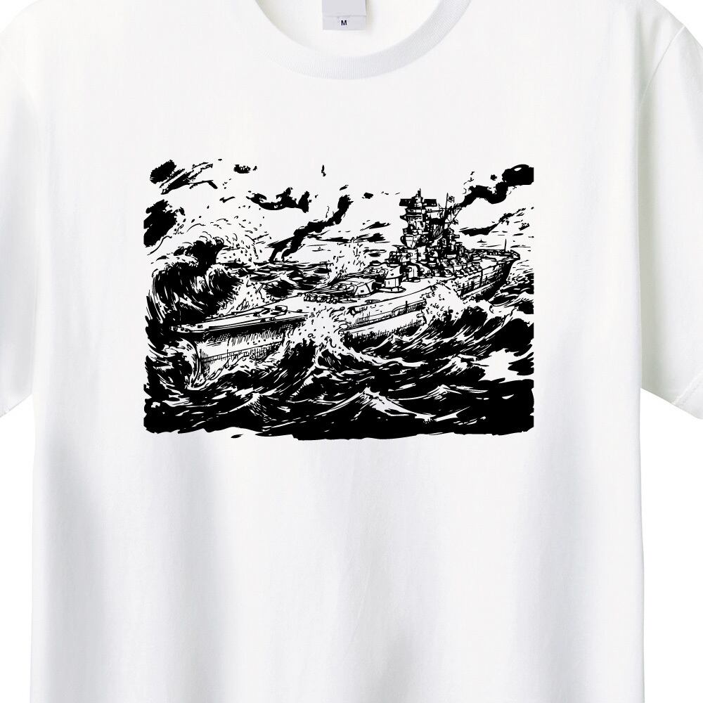 日本海軍の象徴である「戦艦大和」を、躍動感あふれる劇画・墨絵タッチで表現したオリジナルプリントTシャツです。