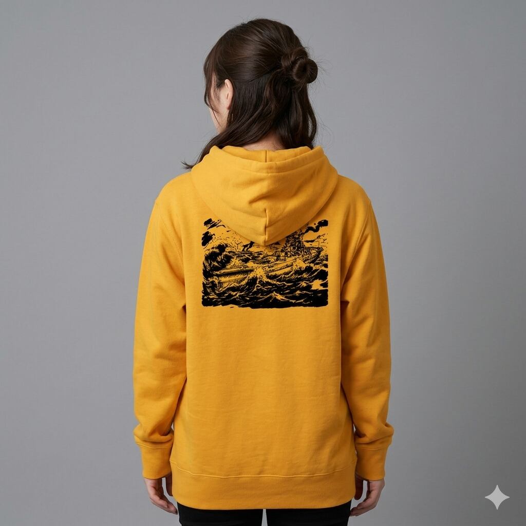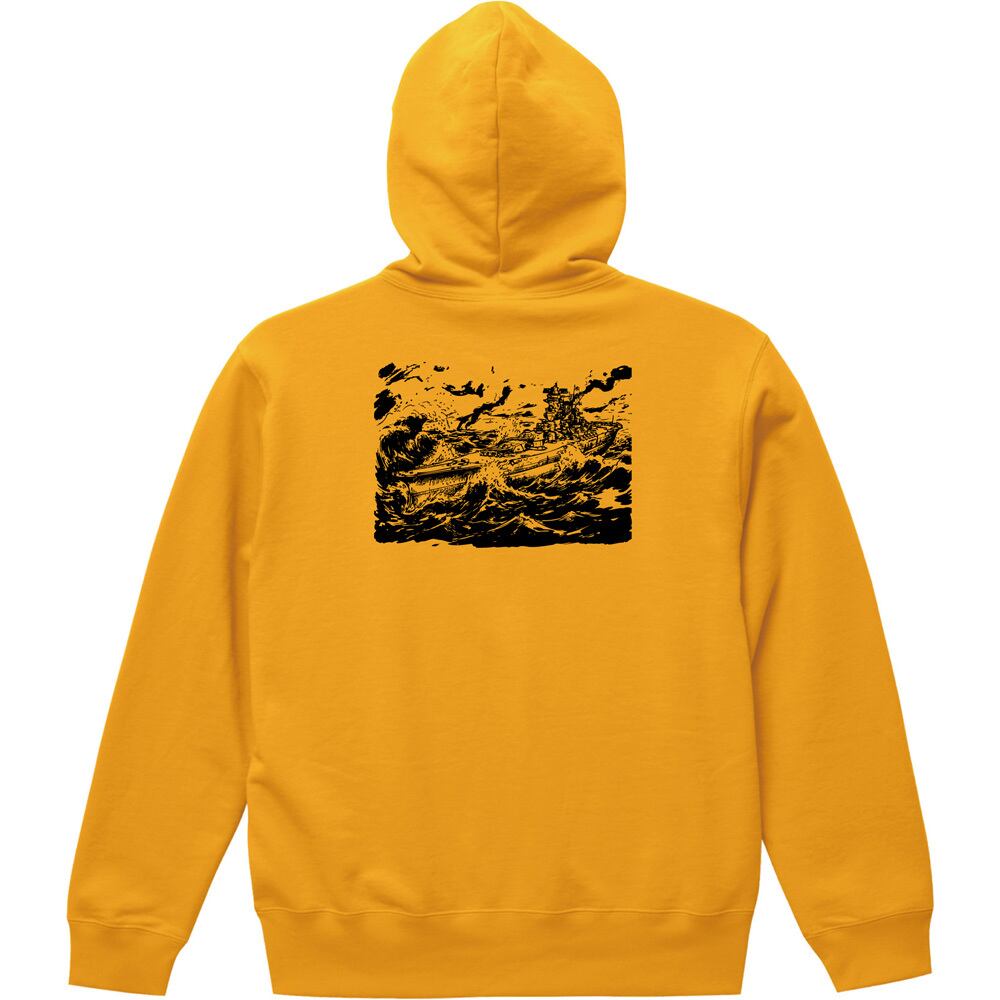日本海軍の象徴「戦艦大和」を、迫力ある劇画・墨絵風のタッチで表現したオリジナルバックプリントパーカーです。荒れ狂う波を突き進む大和の勇姿を背負う、歴史ロマンと現代デザインが融合した一着です。