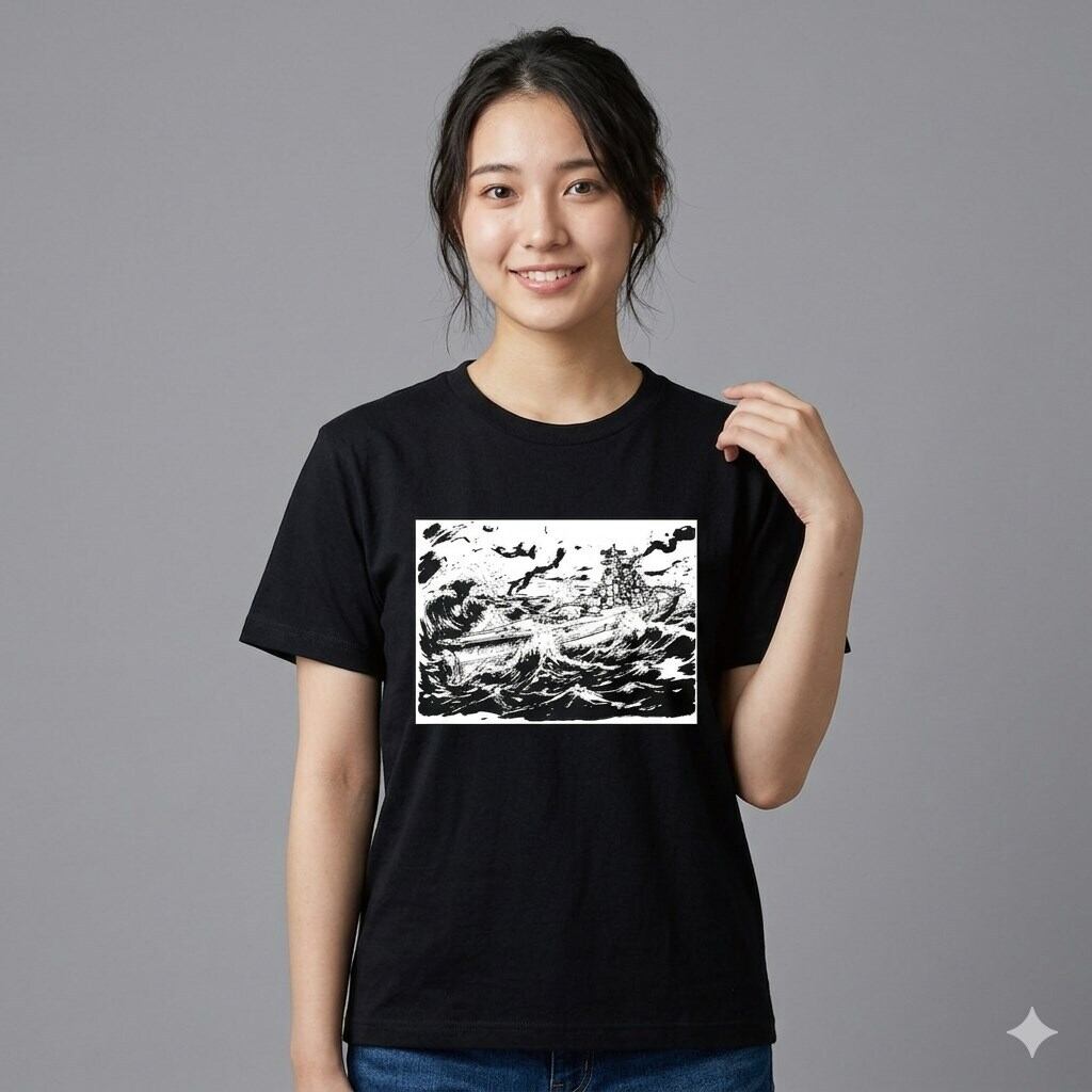 漆黒の海を切り裂く大和。劇画墨絵が白く浮かび上がる重厚な一着。