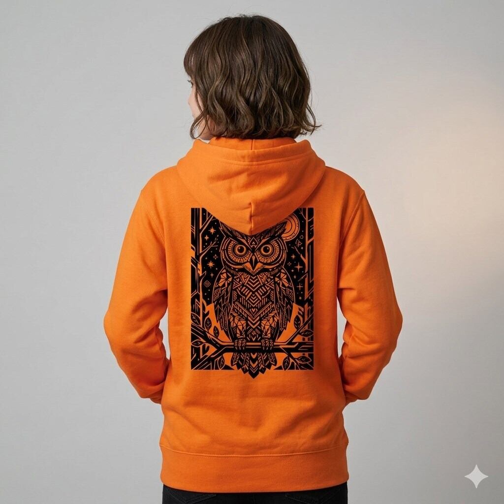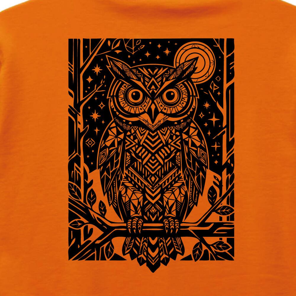 インパクトのあるバックプリントが目を引く、知恵と幸運の守り神「フクロウ」のデザイン。緻密な幾何学模様で構成されたアートは、ストリート感と知性を同時に演出します。