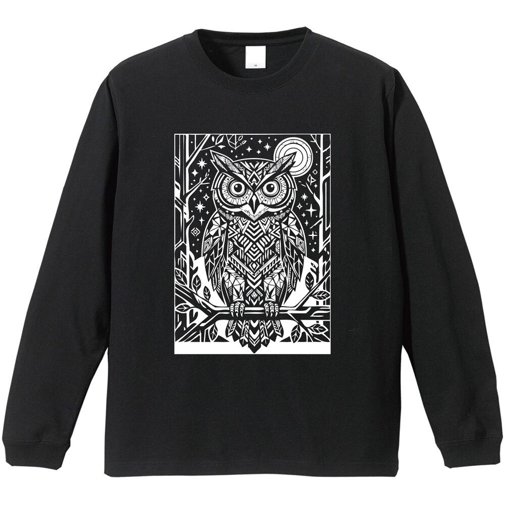 幸運を呼ぶフクロウ 長袖Tシャツ 幾何学模様 ホワイトプリント|ロンT ブラック 黒 モノトーン ユニセックス 北欧風 ジオメトリック ギフト